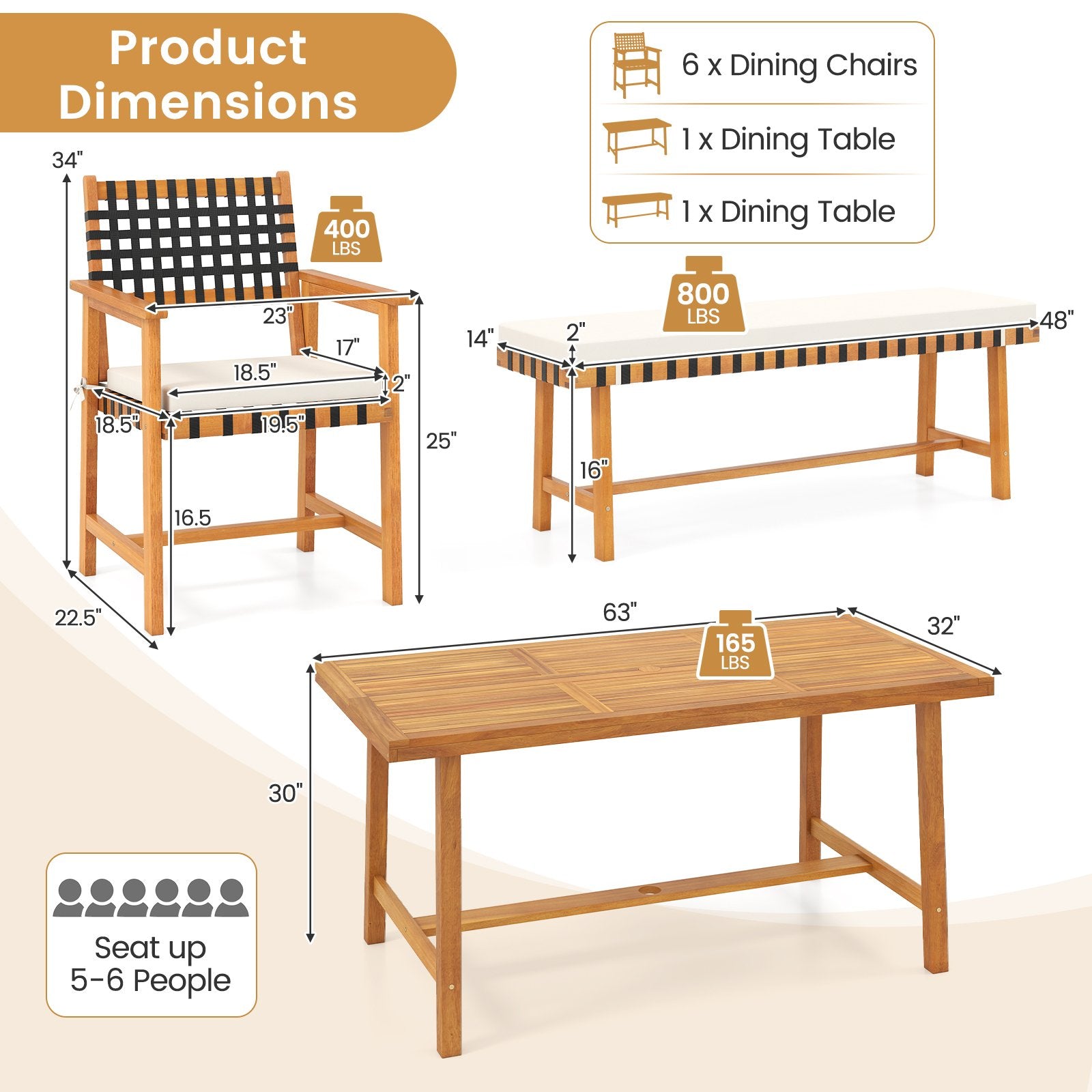 ● Maintenance Tips: The table measures 63” x 32” x 30” (L x W x H) the bench measures 48” x 14” x 18” (L x W x H) and the chair measures 23” x 22.5” x 34” (L x W x H). The slatted tabletop is easy to clean and maintain. To preserve the pristine condition and natural beauty of the acacia wood please apply wood polish oil (not included) to the wood surface regularly.