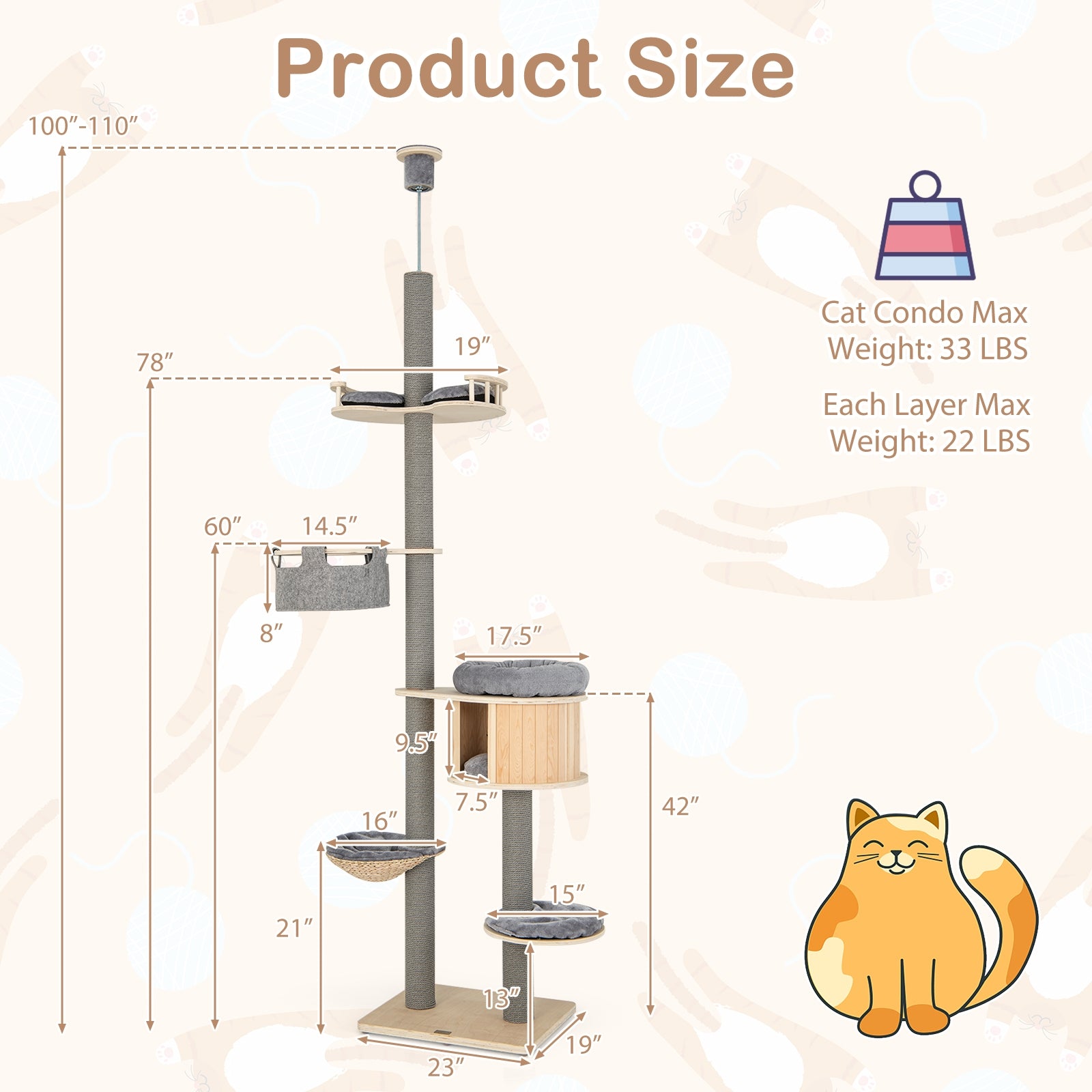 ● Floor-to-Ceiling Cat Haven: Thanks to the adjustable metal fixing rod the cat tower features an adjustable height range from 100-110" which fits different ceiling heights without the need to drill holes. The floor-to-ceiling design maximizes indoor vertical space making it a smart choice for smaller spaces.
