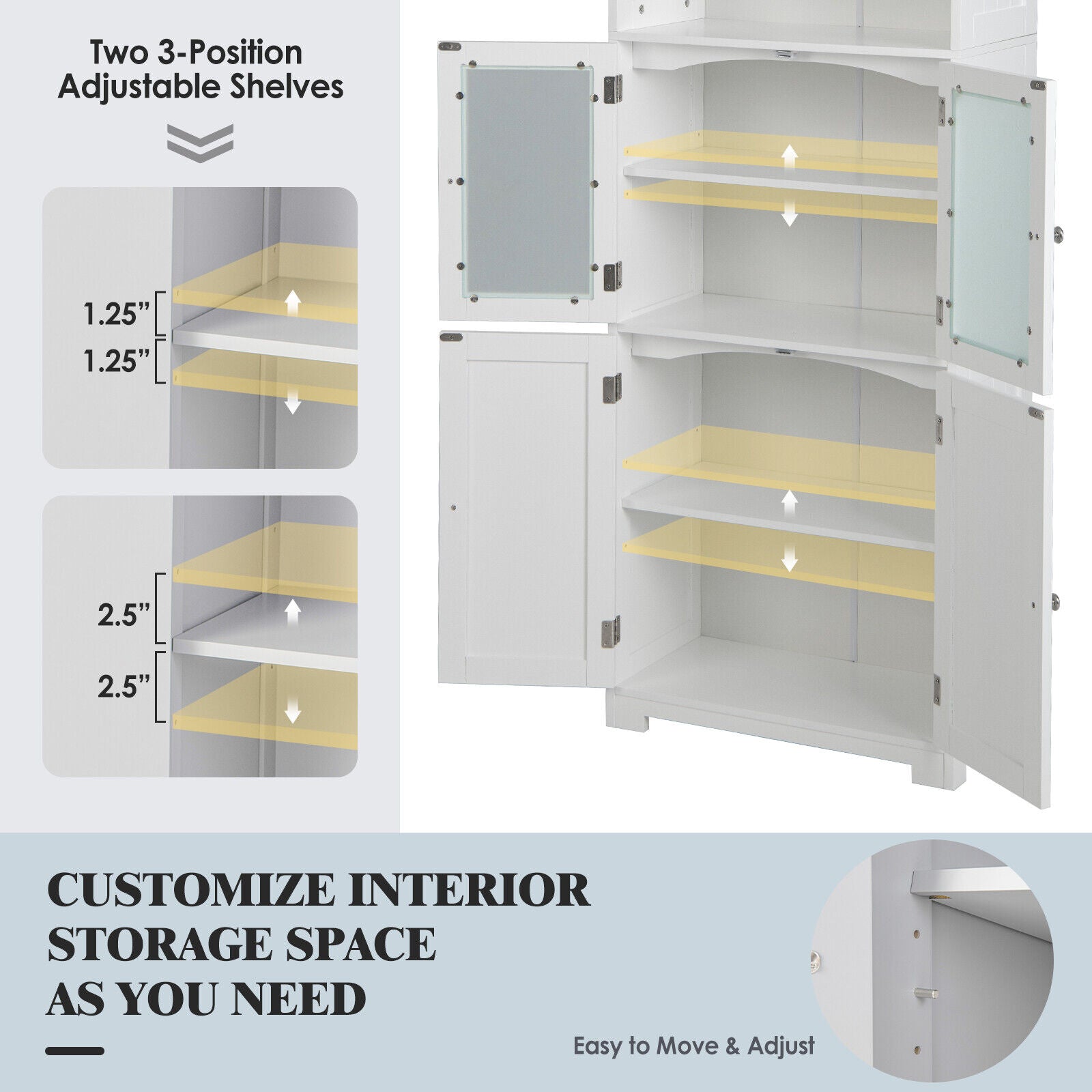 ● 6-Tier Enclosed and Open Storage Space: Equipped with 2-tier open storage shelves and 2 cabinets with doors this tall bathroom storage cabinet offers large storage space to keep various items well organized. Besides there are two 3-position adjustable shelves that allow you to customize interior storage space as you need.