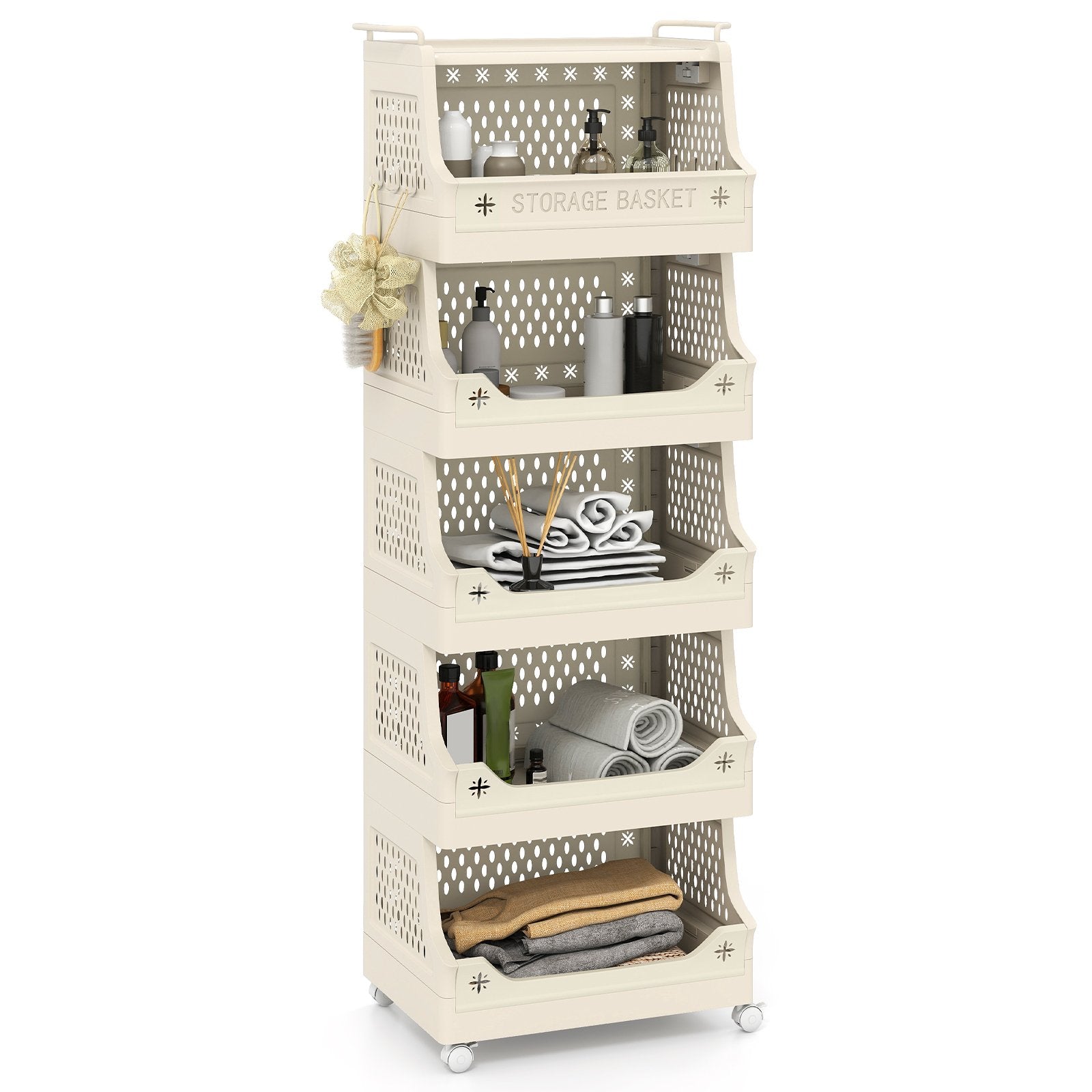 6-Tier Rolling Laundry Basket with Wheels Plastic Storage Cart with Side Hooks