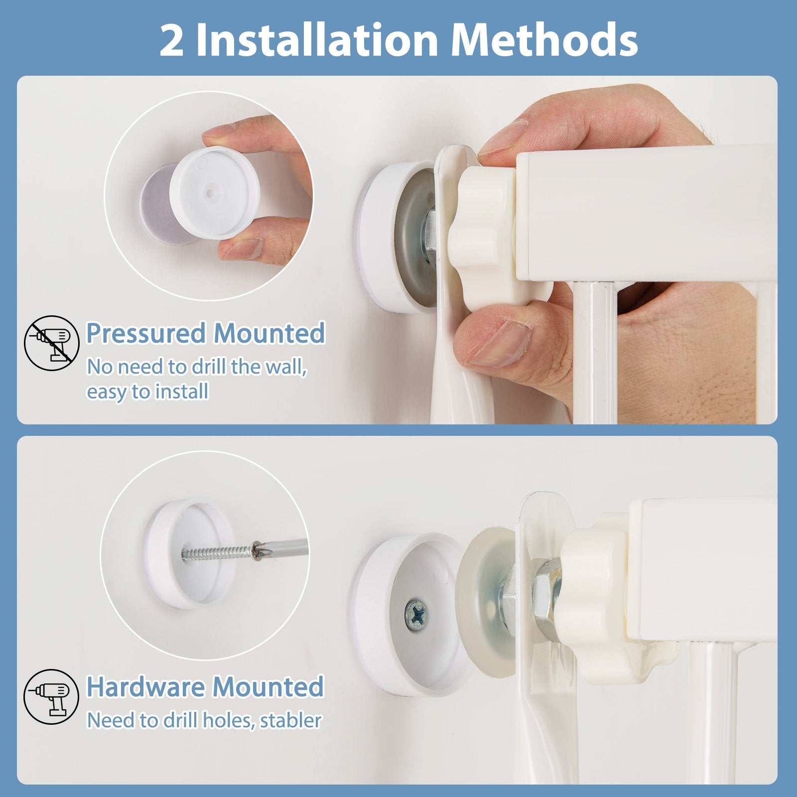 ● 2 Installation Methods: The dog gate is equipped with 4 adjustable pressure mounted kits for a no-drill installation perfect for temporary or semi-permanent setups. Alternatively for more permanent and stable solutions hardware mounted kits are also provided. Warm Tips: Please do not cut off the zip ties until the installation is finished.