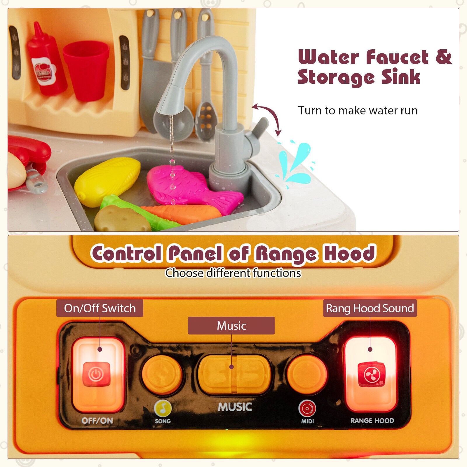 ● Simulated Stove and Range Hood: This simulated cooking stove is designed with realistic light effects and 2 cooking sounds. And its spraying and boiling function ensures a realistic cooking experience. Besides the control panel of the range hood also allows you to choose different functions: lights music and range hood sound. And the light and sound require 9 1.5V AA batteries(not included).
