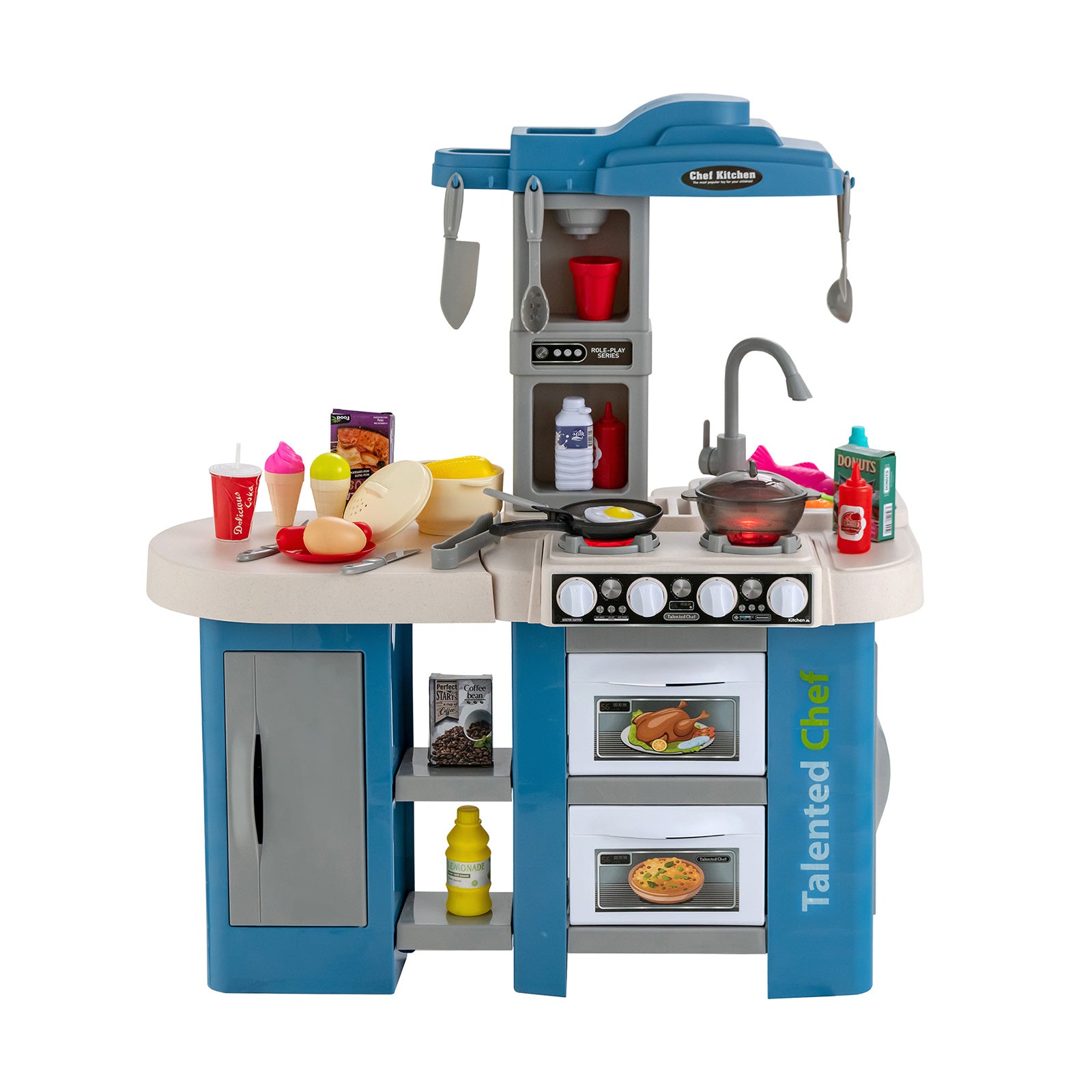 67 Pieces Play Kitchen Set for Kids with Food and Realistic Lights and Sounds-Blue
