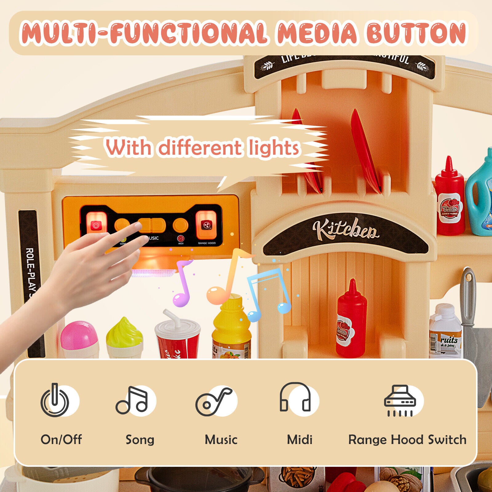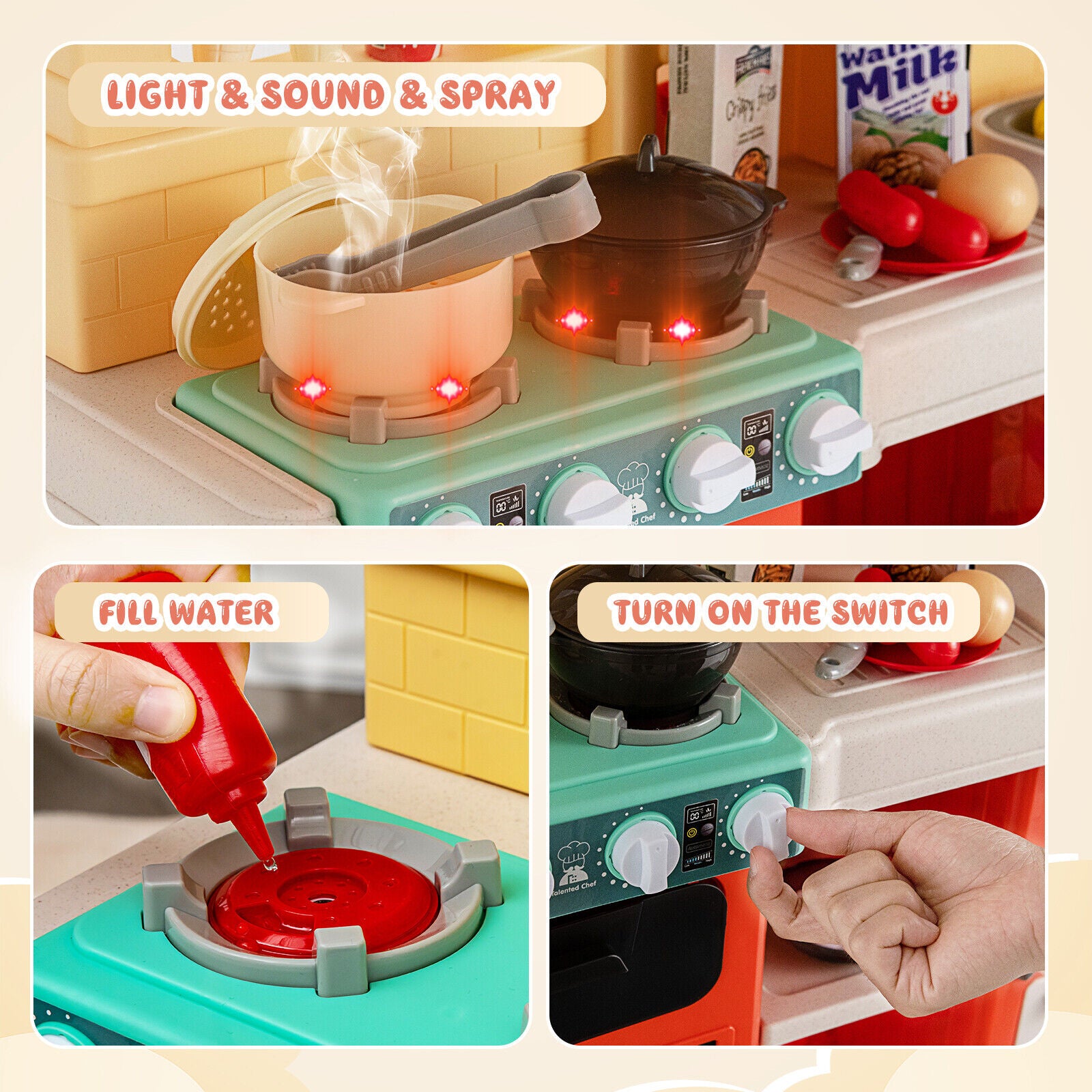 - Real lights and sounds provide a realistic cooking experience to your kids