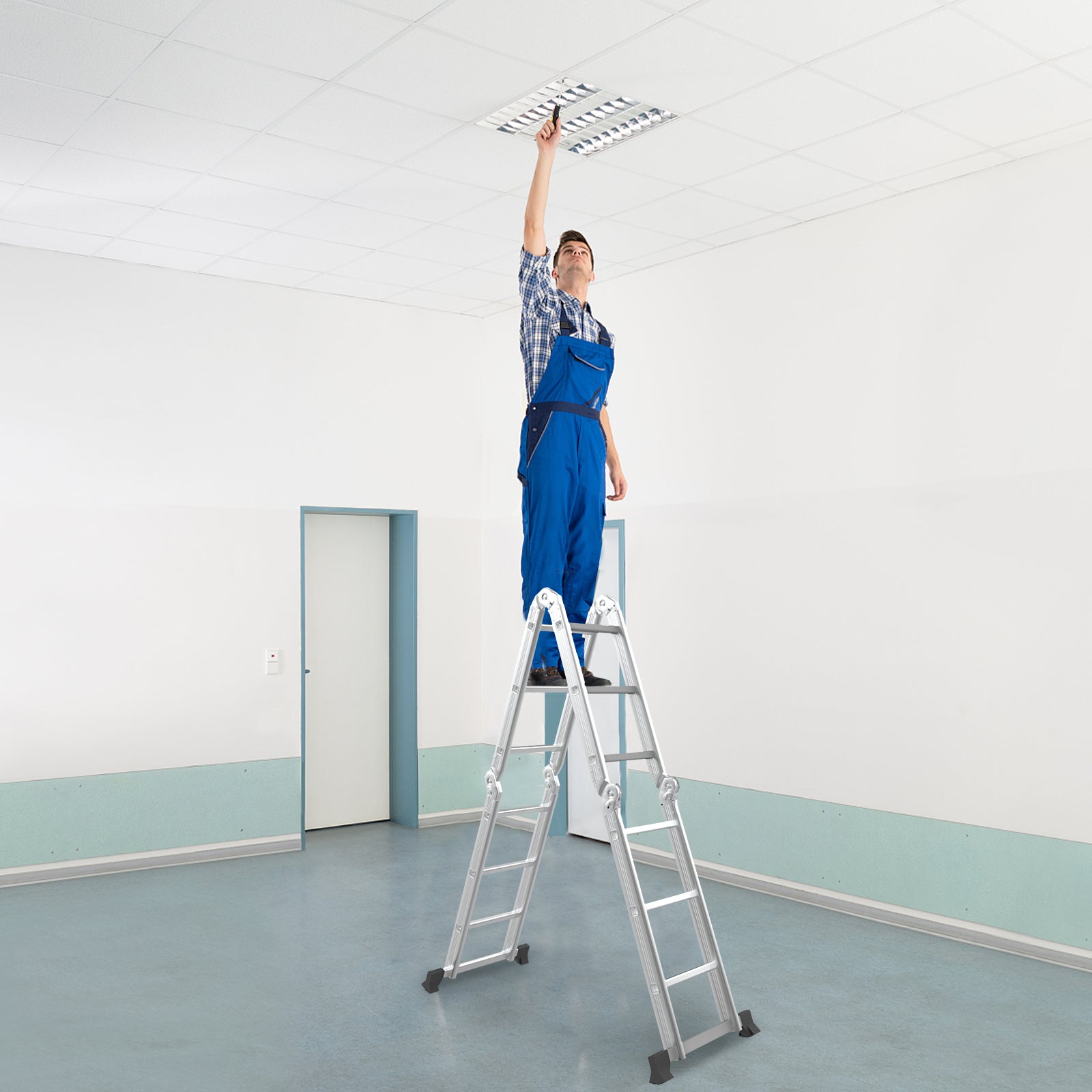● 7-in-1 Multi-Purpose Design: This multifunctional ladder with 4 sections can be transformed into 7 different configurations such as straight ladder step ladder scaffold overhang ladder M-shaped ladder and staircase ladder. Thus it will perfectly meet your different demands in daily life whether in outdoor or indoor places.