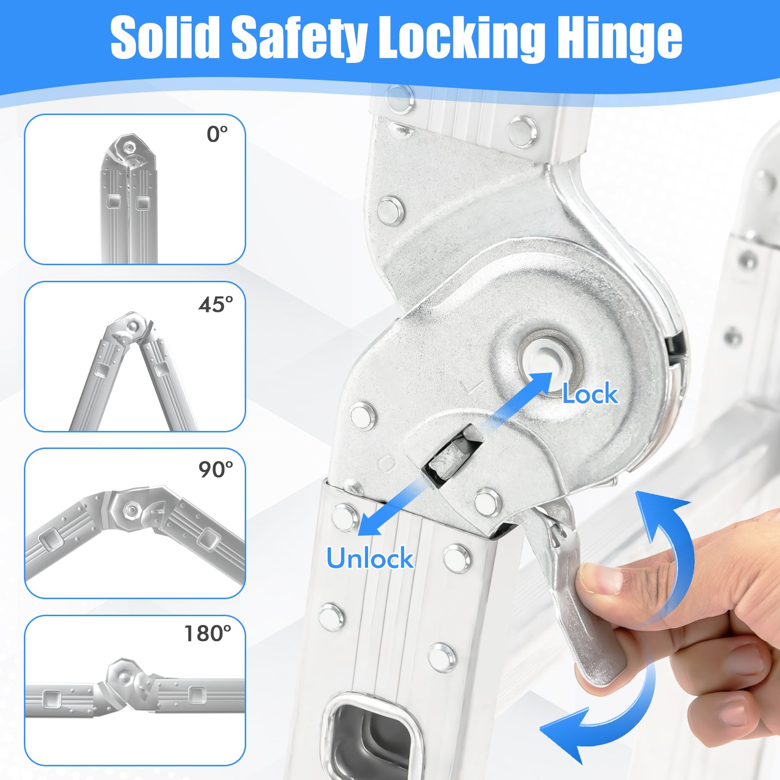 ● Convenient Adjustment: This aluminum ladder adopts large joints with locking device between each section which can be adjusted from 0° to 45° 90° or 180°. Therefore you can change the configuration of the ladder with more convenience.