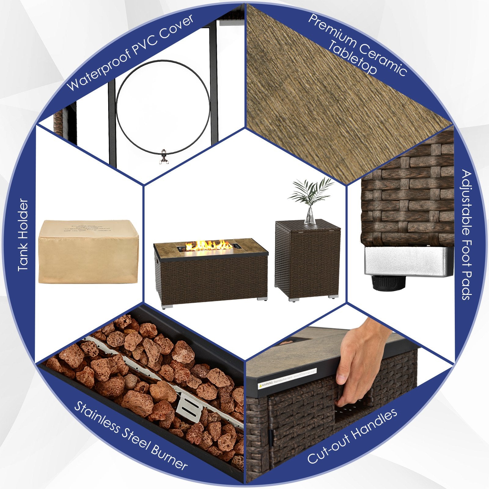 ● Propane Tank Hideaway Table: This backyard furniture set includes a propane tank cover table which hides the 20 lb standard propane gas cylinder (not included) from sight. Moreover it features an openable top for easy access and a secure tank base holder to keep it in place.