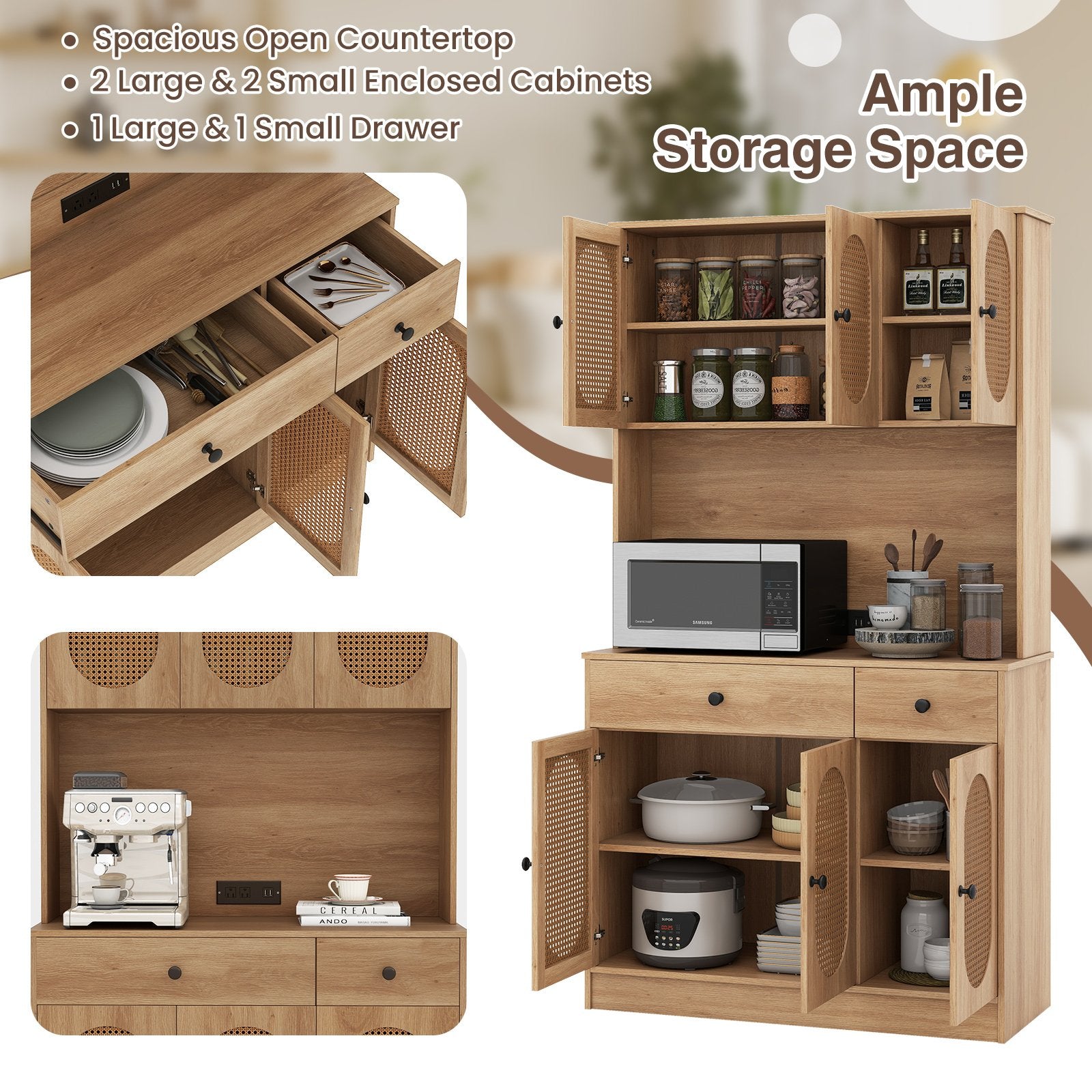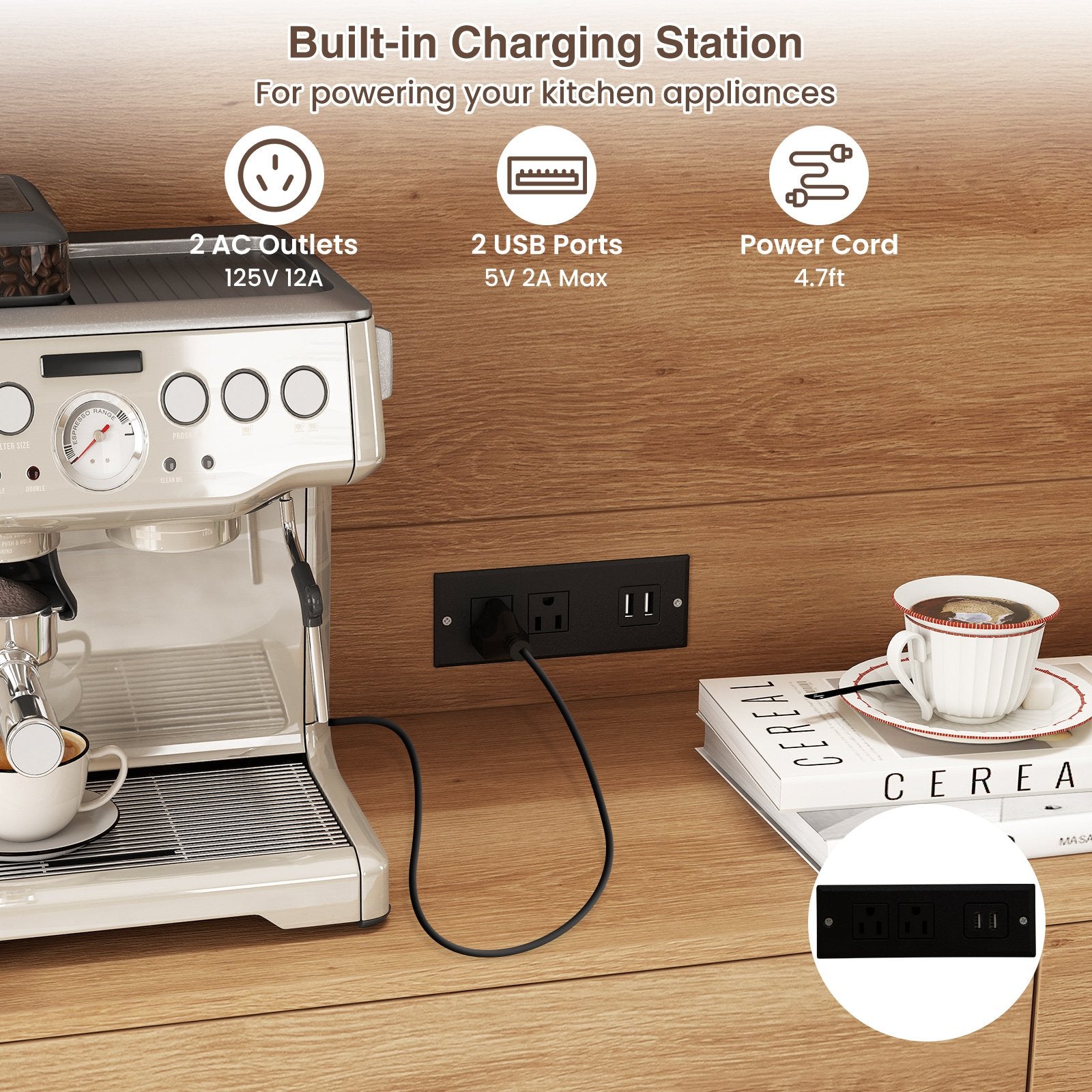 ● Built-in Charging Station: The buffet cabinet comes equipped with a charging station above its spacious open countertop offering 2 AC outlets and 2 USB ports. This convenient setup provides easy access to power for your kitchen appliances and electronic devices.