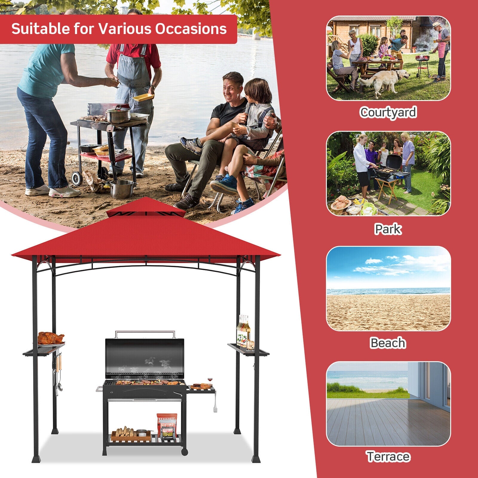 Add aesthetics and utility to outdoor barbecue party with this grill gazebo. Our grill gazebo feature double roof and 360 degree ventilation which allows for smoke and odors to be vented out quickly. It provide perfect complement to your barbecue . Covered with a UV water and fire resistant polyester canvas weather would not be a issue. It can keep out rain and UV. It is an ideal option for you! The durable construction with ground stake which ensures sturdy an stability. Plus some extra intimate design provide convenience to party. For example a bottle opener built in the frame which ensure that the beverages can be open easily. Two metal shelves are designed to put food and get convenient. Moreover 5 hooks be installed in the side shelf for store grill tools. So all you need to do is this barbecue grill gazebo and usage after assembling.