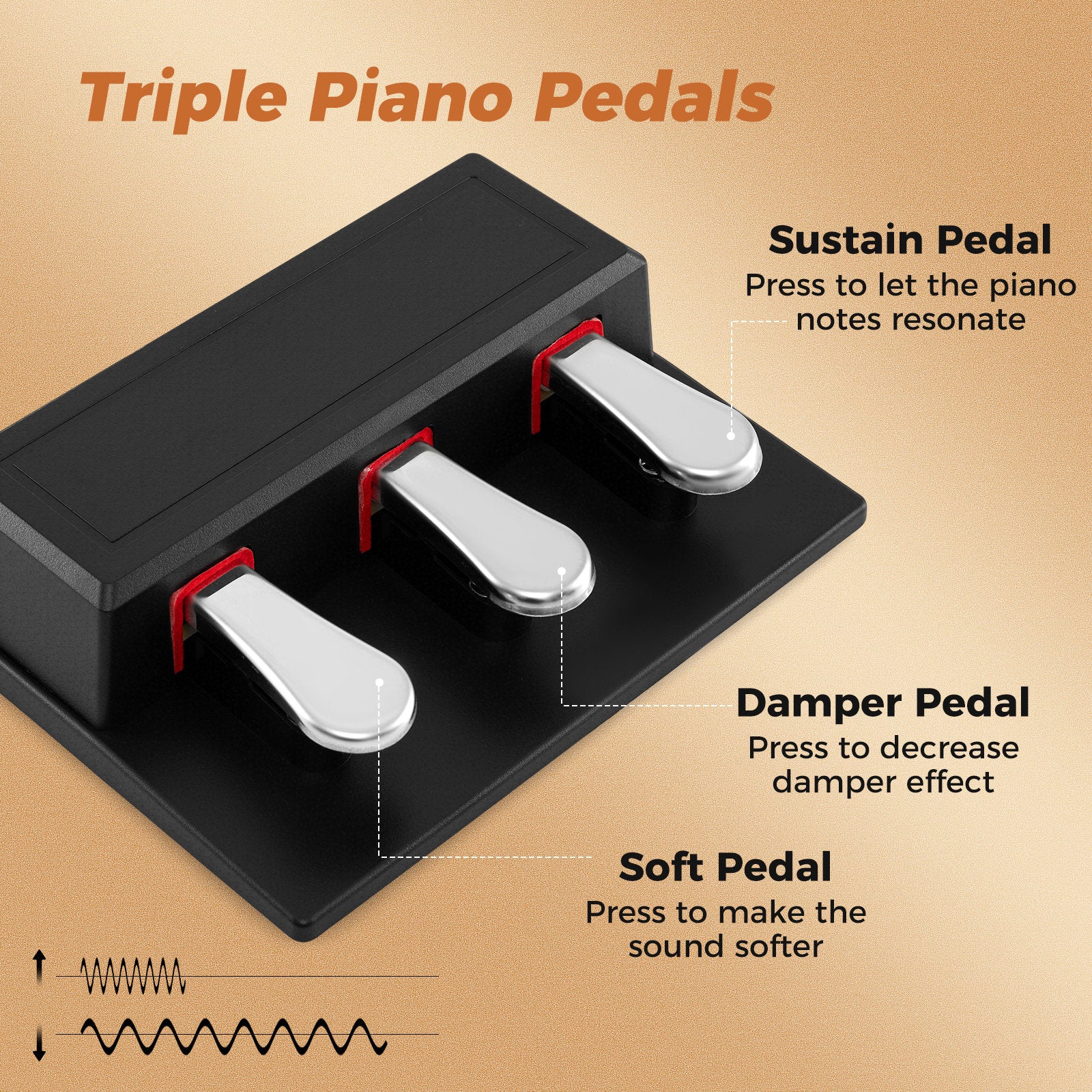 Semi-weighted Keyboard and Pedals: The keyboard has 88 standard full size keys to make you feel like playing a real piano. There are 4 strength levels for adjustable touch response. It also comes with triple piano pedals (soft pedal sostenuto pedal and sustain pedal) to change the sound effect.