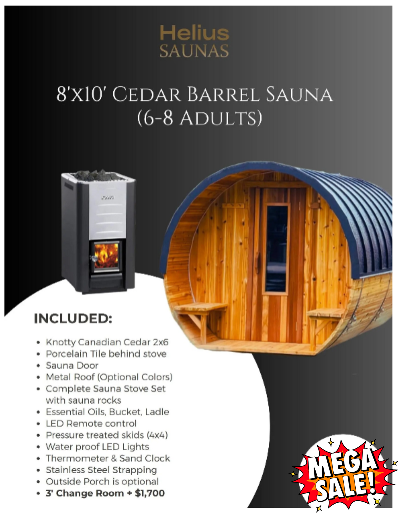 Transform your backyard into a sanctuary with this beautiful Cedar Barrel Sauna where relaxation, health, and elegance meet. Experience the timeless tradition of sauna bathing, now with a sophisticated touch. Perfect for those who demand both style and wellness in their lives.