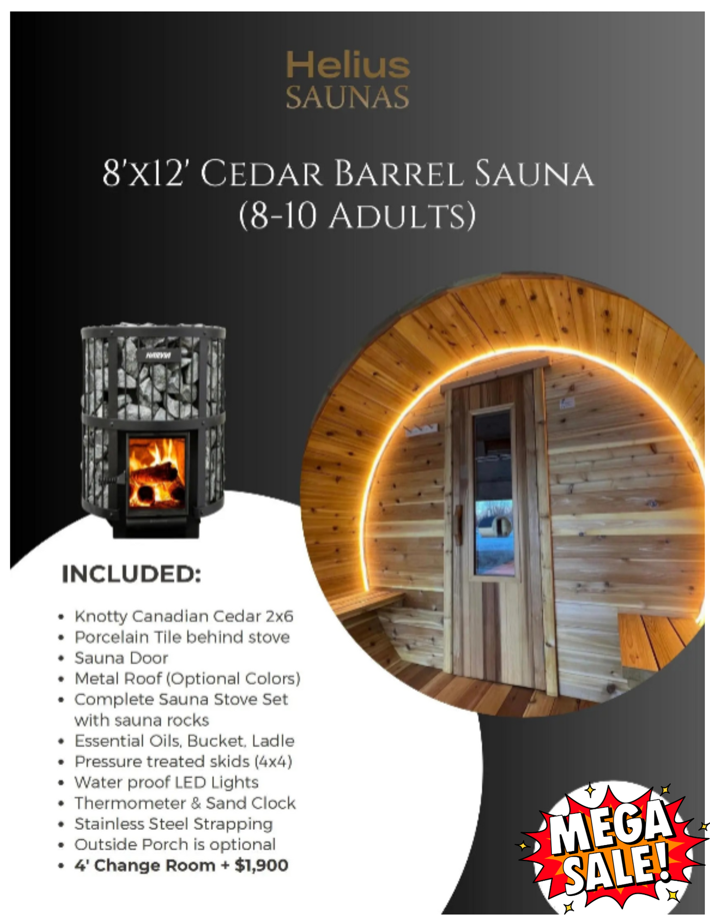 8'X12'CEDAR BARREL SAUNA(8-10 ADULTS)
