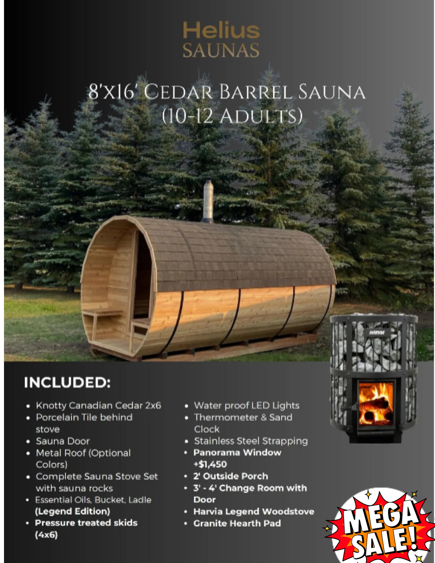 8'XI6 CEDAR BARREL SAUNA(10-12 ADULTS)