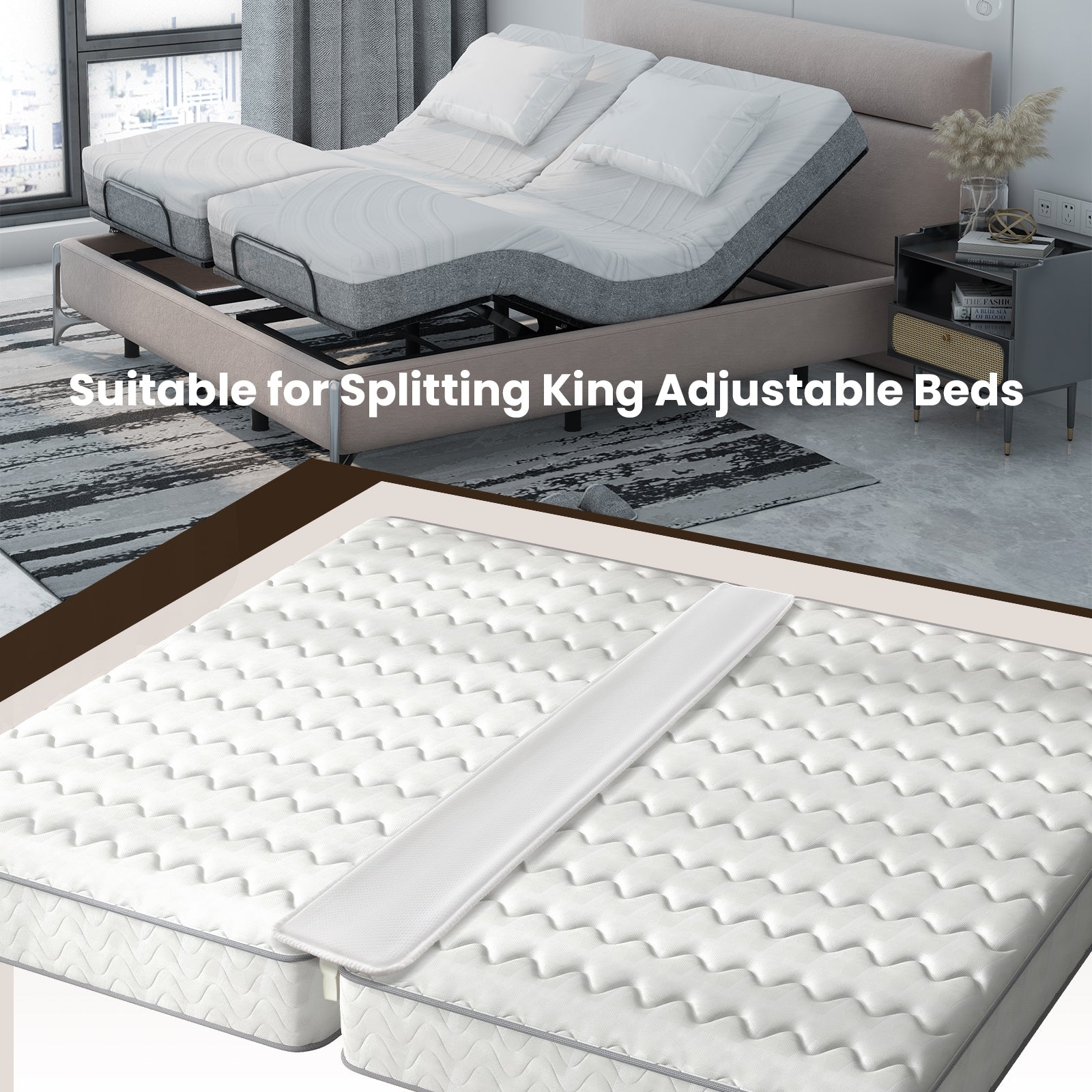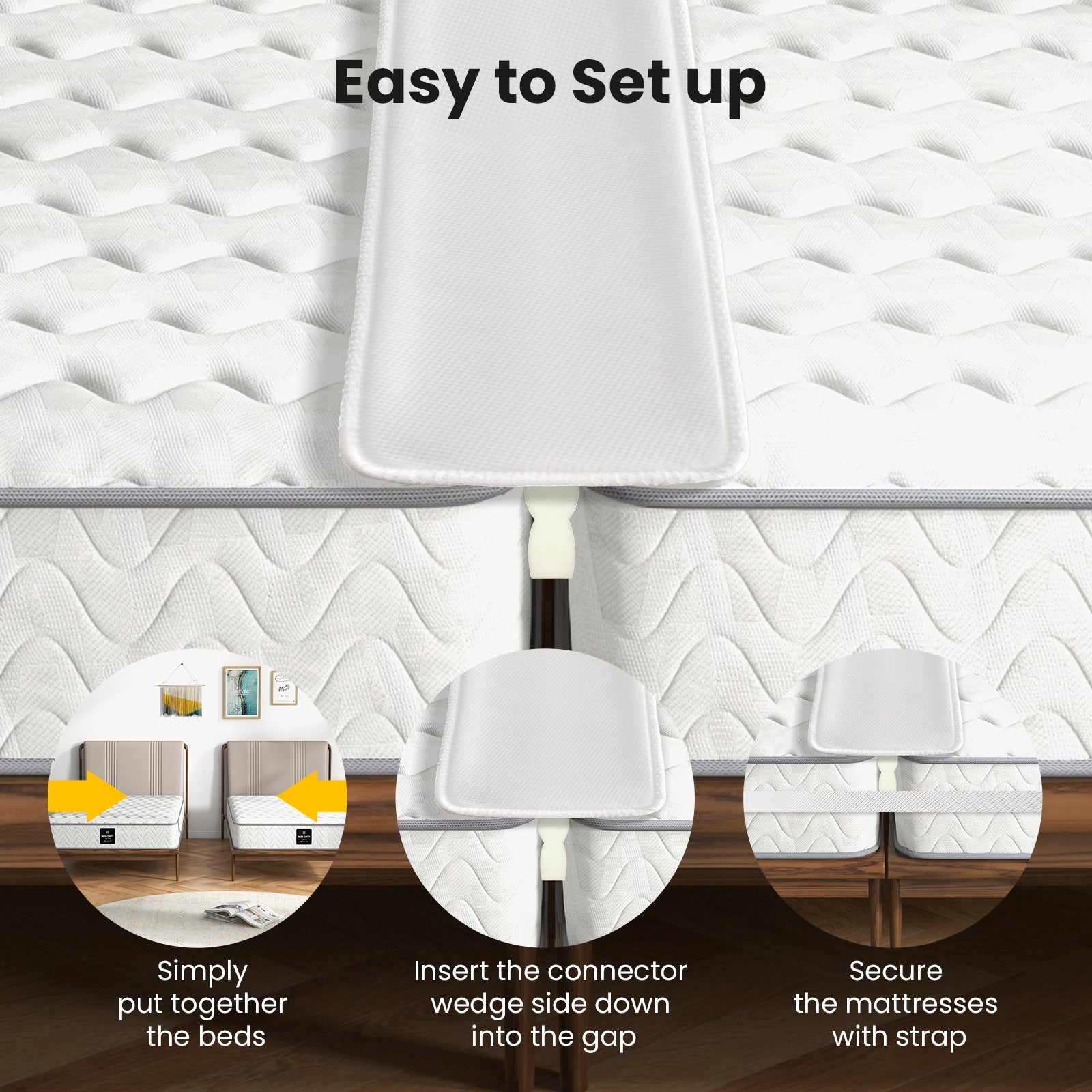 ● Easy to Set up: The mattress connector also contributes to easy assembly! You can combine 2 twin/twin XL beds into 1 king bed in minutes. Simply put together the beds insert the connector wedge side down into the gap and secure the mattresses with strap.