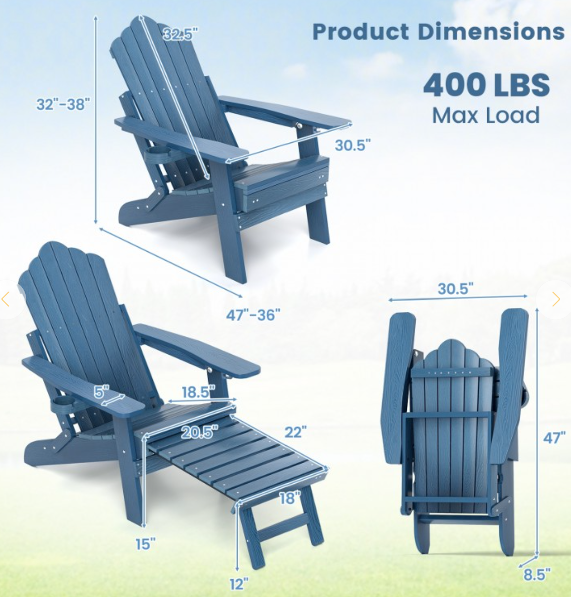 ● Perfect Outdoor Furniture: Whether placed on your lawn, patio, or backyard, this Adirondack chaise lounge will provide an inviting atmosphere for gatherings. Overall dimension without footrest: 47" -36" x 30.5" x 32"-38" (L x W x H).