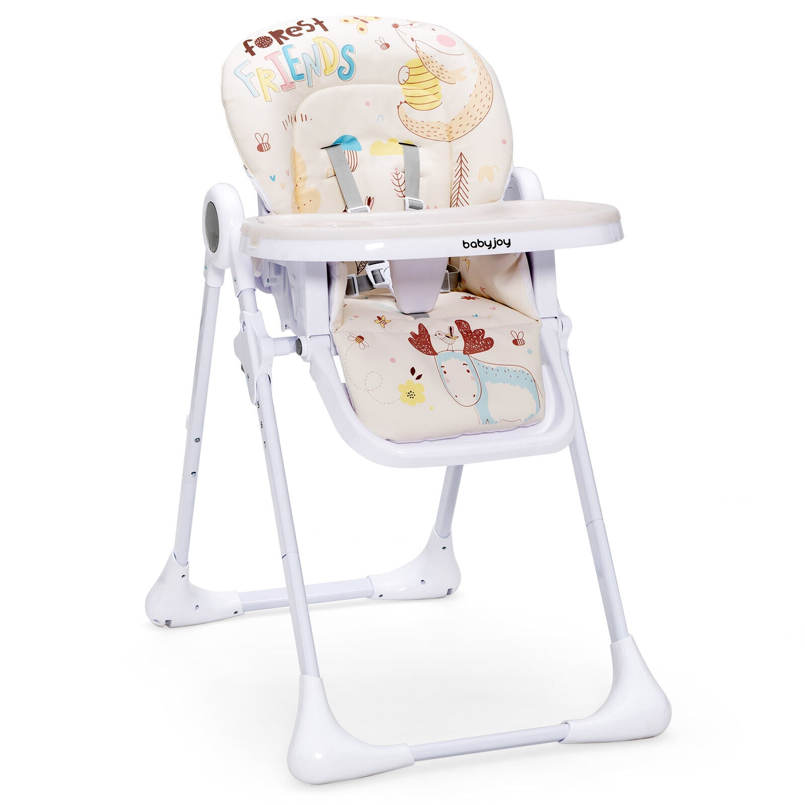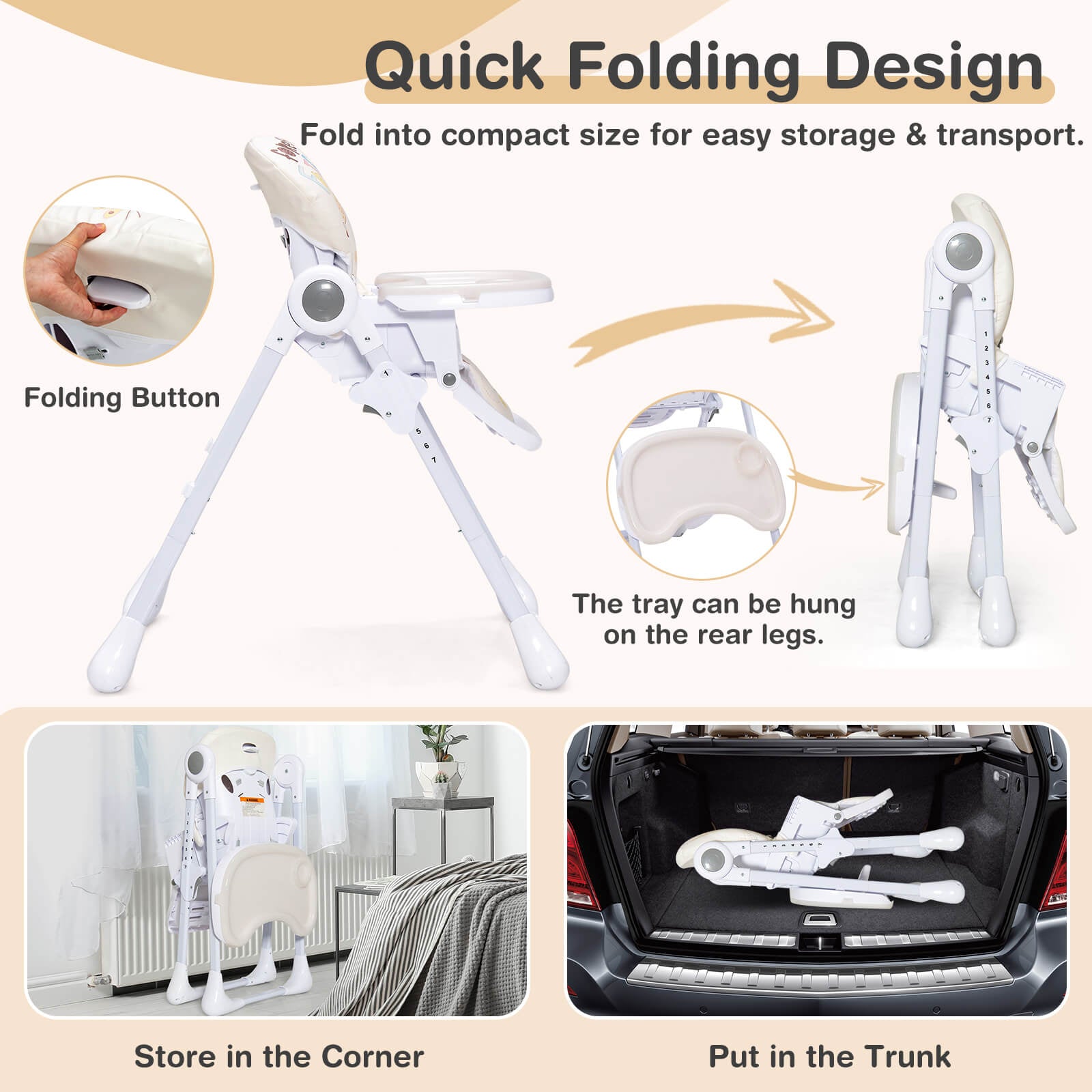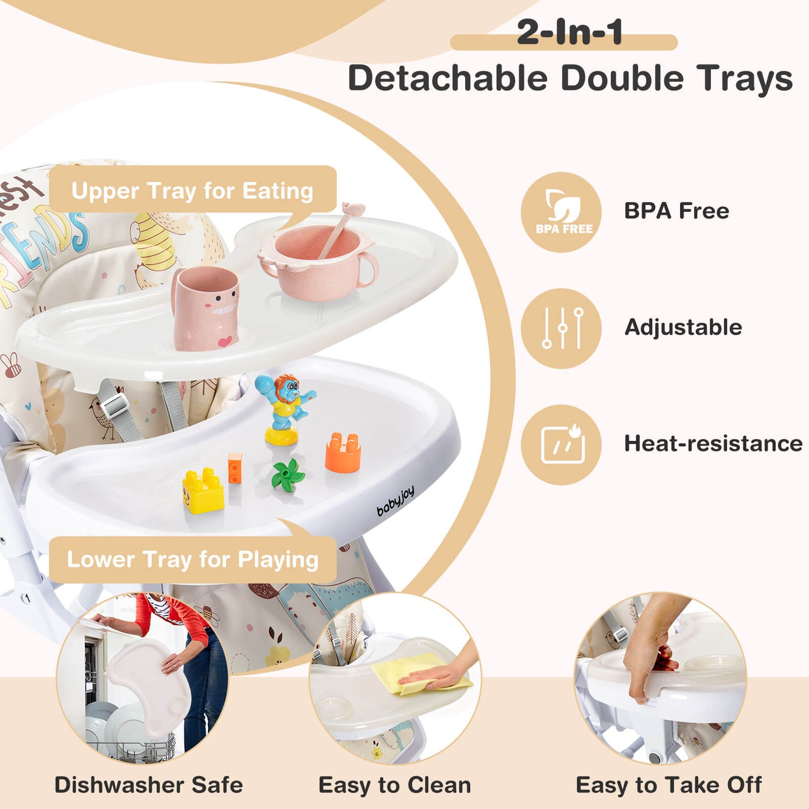 The double tray is removable and attachable to the rear legs. Also this reclining baby high chair is quickly folded for storage and transport. With waterproof PU cushion and dishwasher safe double tray the maintenance is no longer painful. The frame is made of premium steel pipes and constructed in the triangular shape to provide better stability. Also the 5-piont safety harness and anti-falling barrier increase security when parents are not around. The assembly is easy with detailed instructions.
