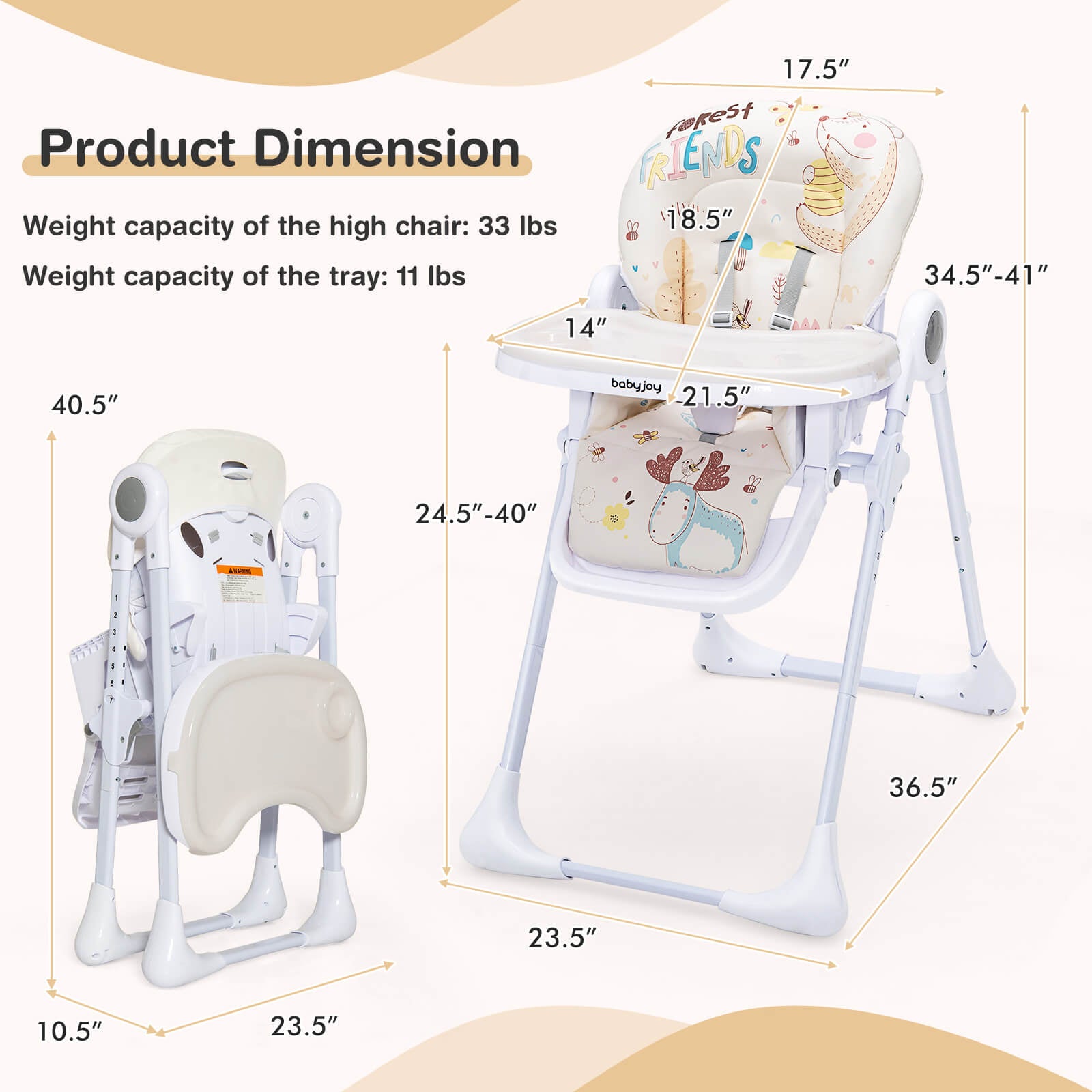 - Weight capacity of the high chair: 33 lbs