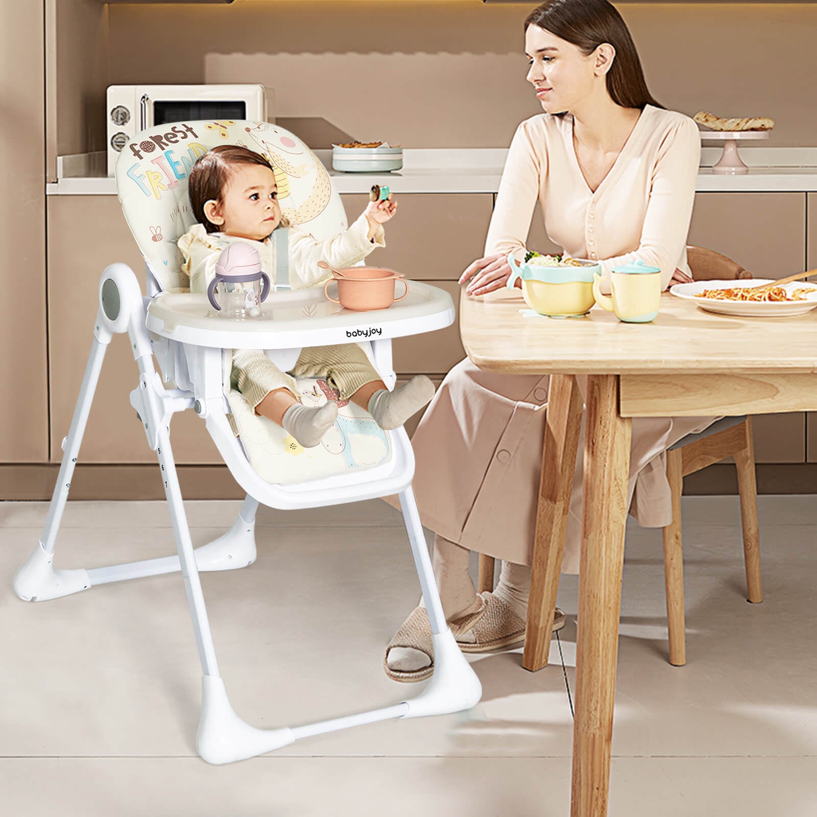 ● Multiple Adjustments for Growing Babies: Featuring 7-position heights 3-position reclining backrest 3-position tray 4-setting footrest parents can easily pull up the high chair to fit your kitchen countertop or dining chair. Every babies in different ages or heights will feel comfortable to have dinner play and rest. Ideal gift for babies in 6-36 months.