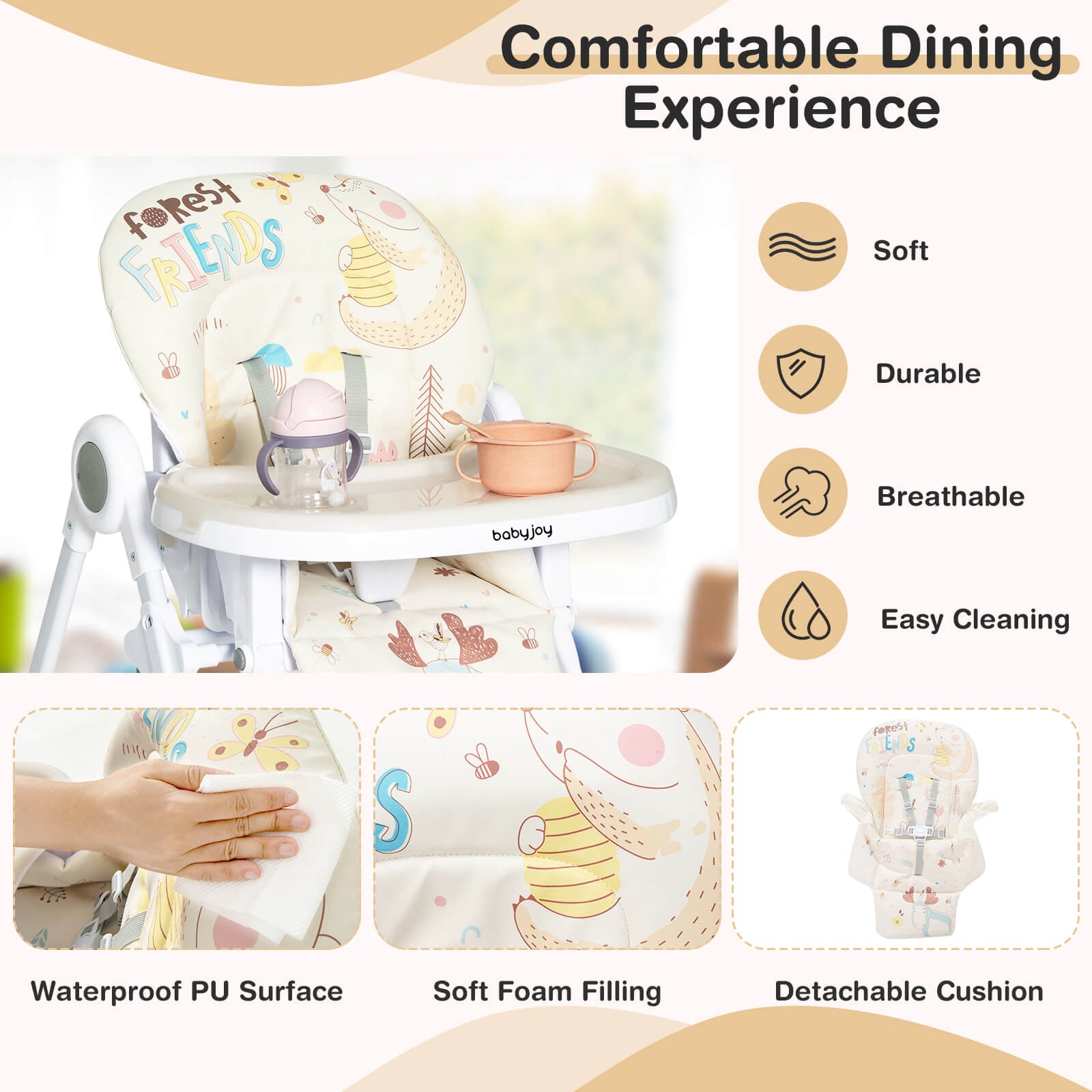 ● Skin-friendly Material and Easy Clean: Made of quality PP material this baby dining chair will not harm your baby's health. The seat cushion with waterproof PU cover is soft and skin-friendly providing your toddler a comfortable place to seat. Parents can remove the cushion and wipe clean allowing your child always have a clean space to enjoy meals and snacks.