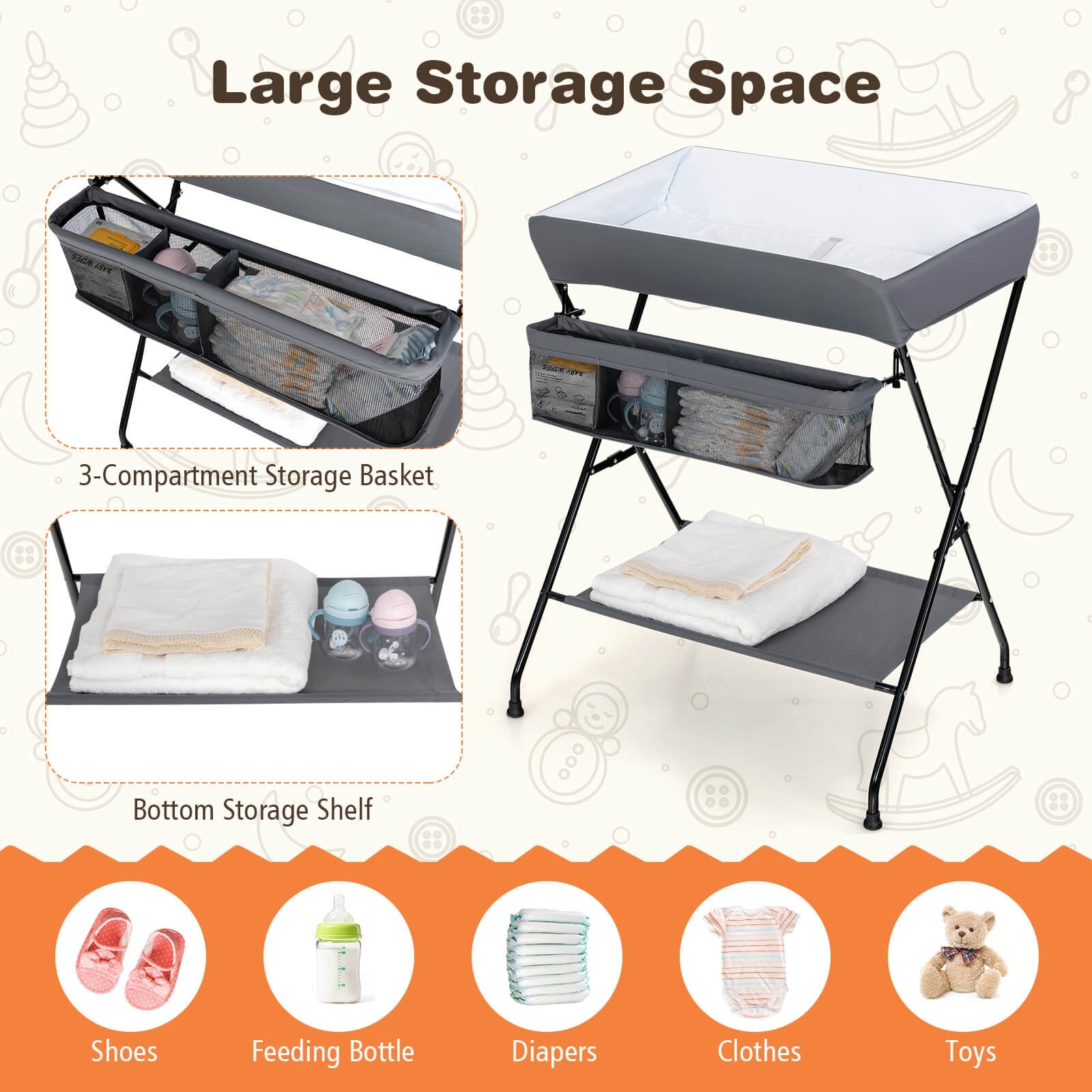 ● Large Storage Space: Equipped with 3 compartments aside the table you can place diapers towels and any other accessories conveniently. If there are more items needed the lower storage space is available to keep toys diaper pail and baby clothes etc.