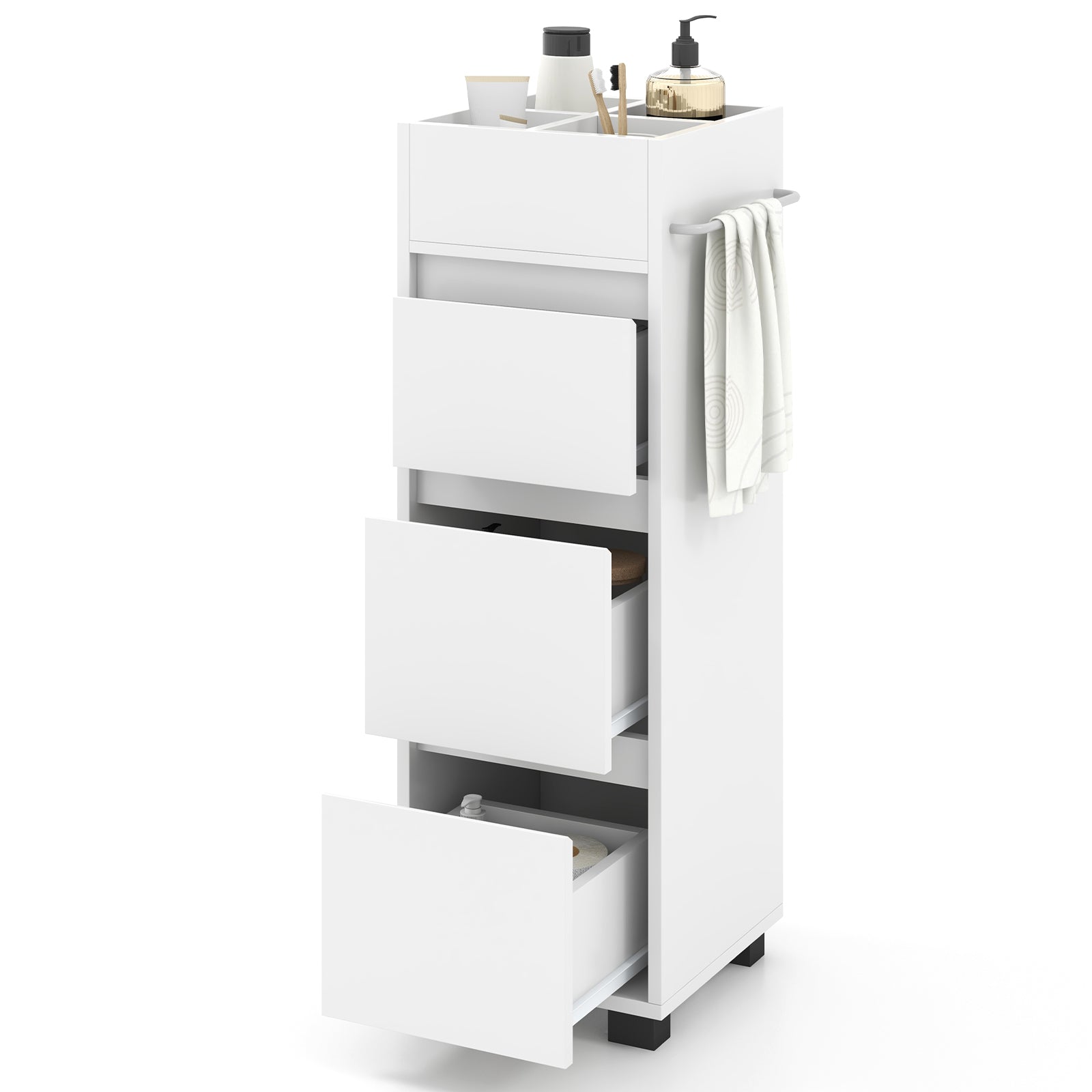 ● Ample Storage Space: Featuring a 4-way top divider 3 drawers and a convenient towel rack this freestanding storage organizer is designed for efficient organization. The top dividers are ideal for often-used items while the drawers keep your bathroom essentials from water.