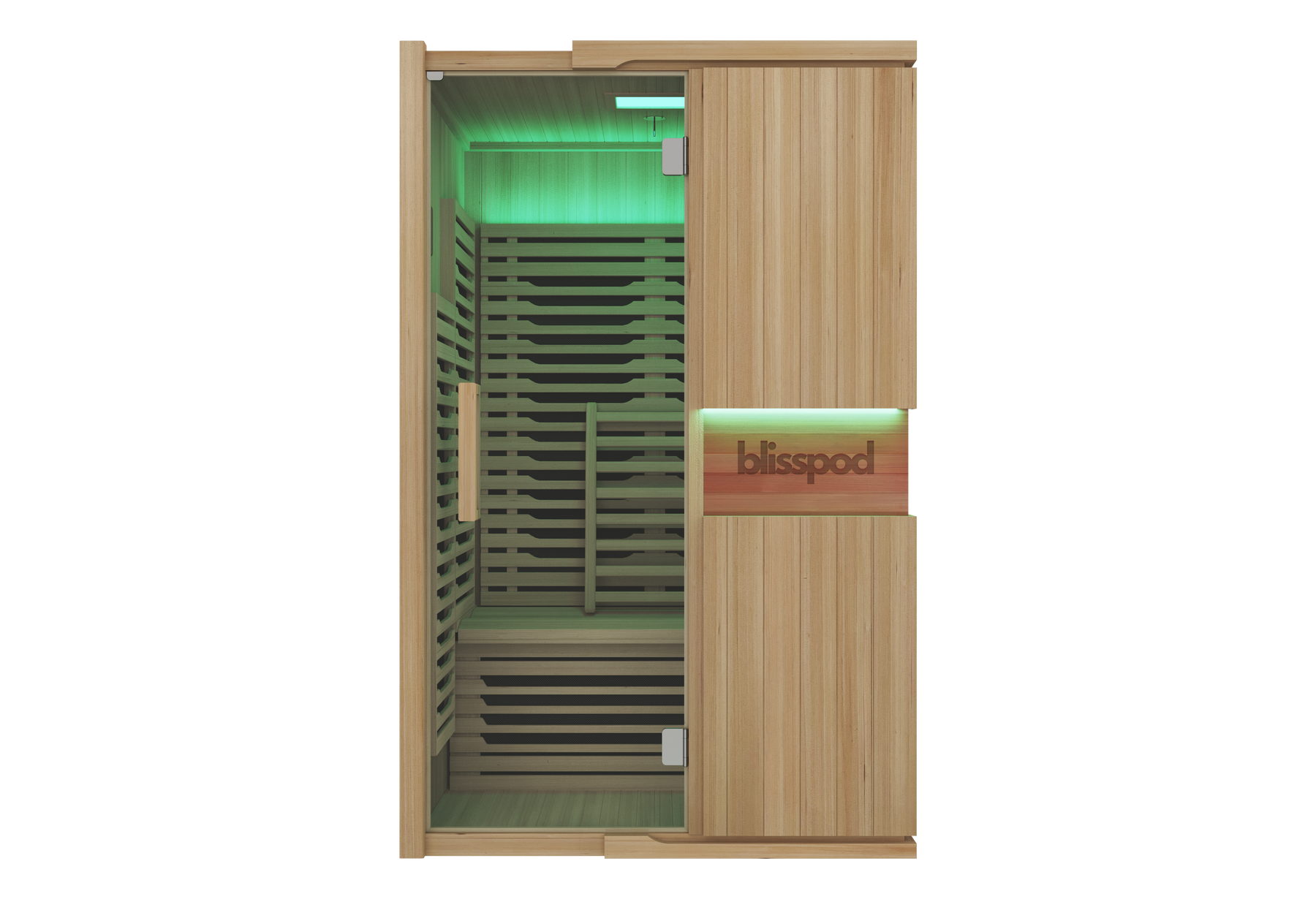 Blisspod, Milano, Full Spectrum Sauna Canadian Hemlock Ultra Low EMF, 6 Far Infrared & Red Glass Heater & Chromotherapy – 2 Person front that easily integrates & blends in your space in the house.