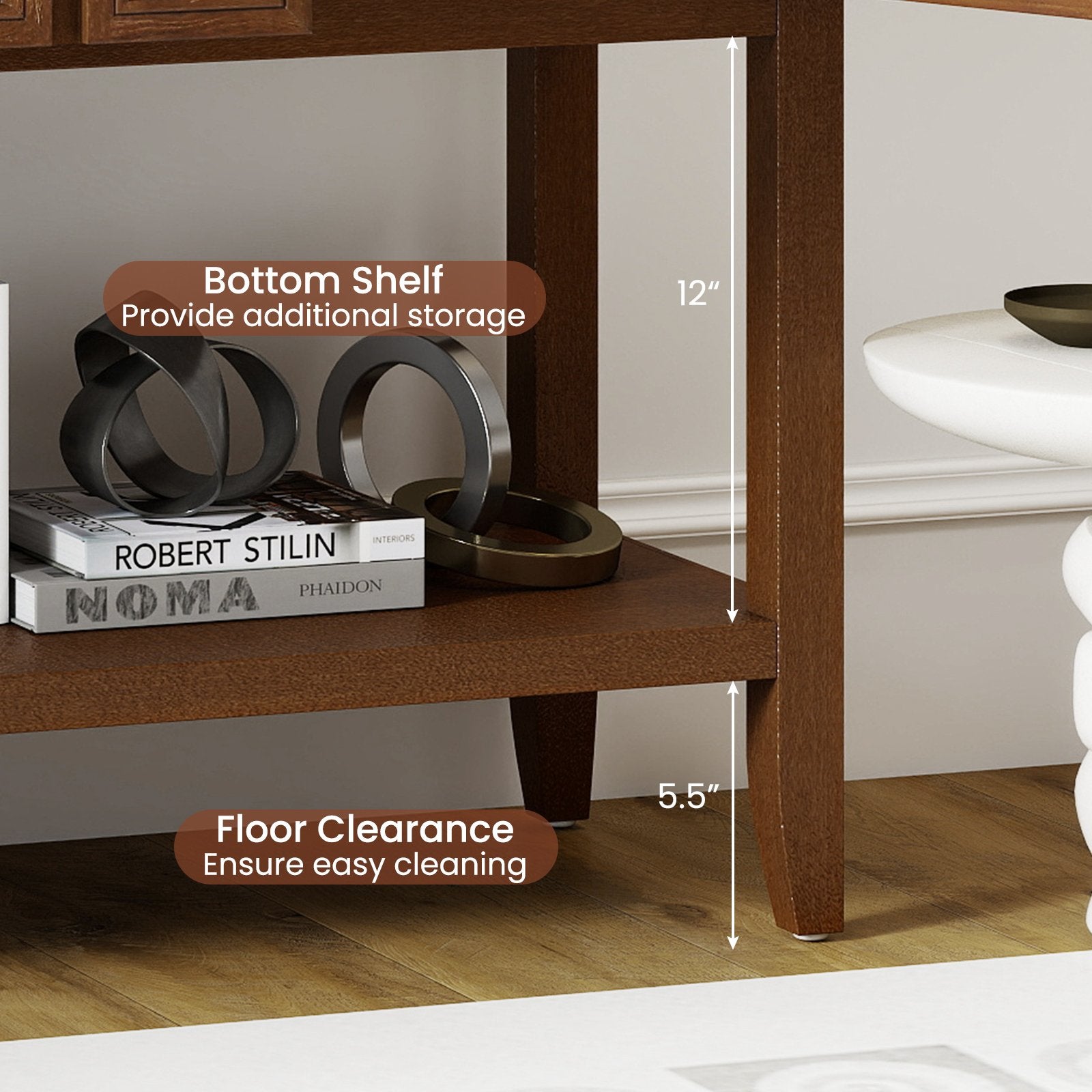 Vintage Appeal: This sofa table with doors combines vintage charm and contemporary efficiency with its clean lines and rustic knobs adding a touch of timeless elegance to your living area.