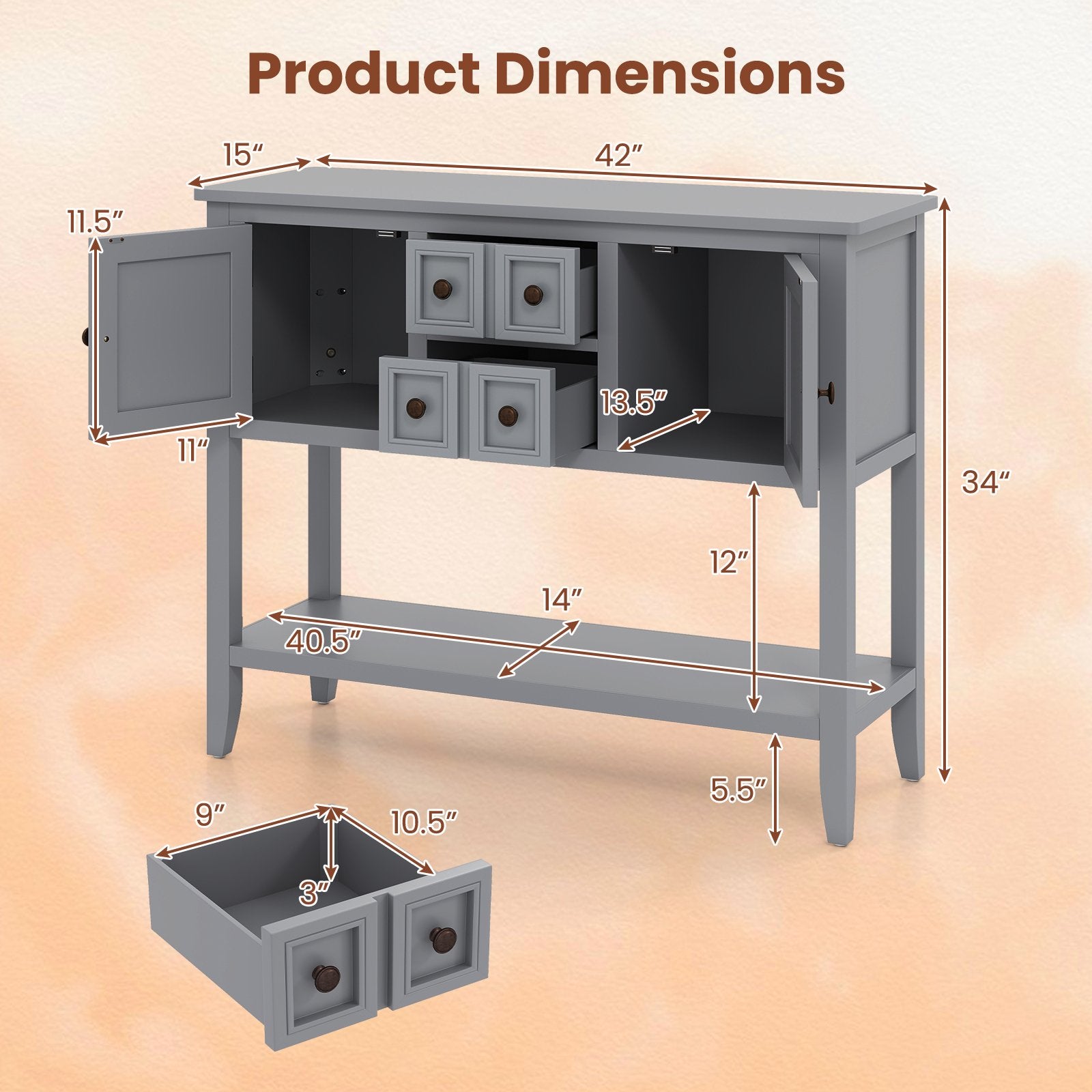 Spacious Storage: With a wide countertop 2 enclosed cabinets 2 smooth-operating drawers and a bottom shelf this entryway table keeps various items from dinnerware to baskets effortlessly organized.