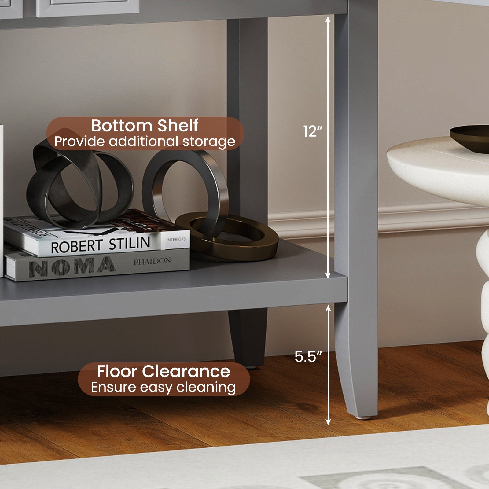 Vintage Appeal: This sofa table with doors combines vintage charm and contemporary efficiency with its clean lines and rustic knobs adding a touch of timeless elegance to your living area.