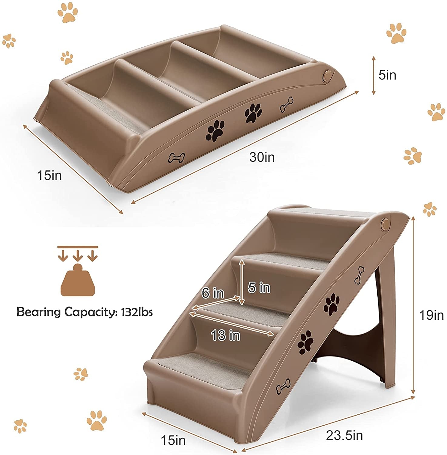 It's suitable for small and medium sized pets which are not tall enough to reach the bed or couch. The lightweight pet stairs provides your furry friend the freedom to get on and off furniture by themselves. Weighing only 4.5lbs it's easy for you to carry and move it around your house. Made of lightweight but durable PP material these plastic pet stairs are sturdy enough to support up to 132lbs. The felt stairs side rails and non-skid foot pads ensure the safety of your pets helping them confidently walk up and down without wobbling. And it's convenient to store the compact pet stairs by simply folding them and putting them under a piece of furniture.
