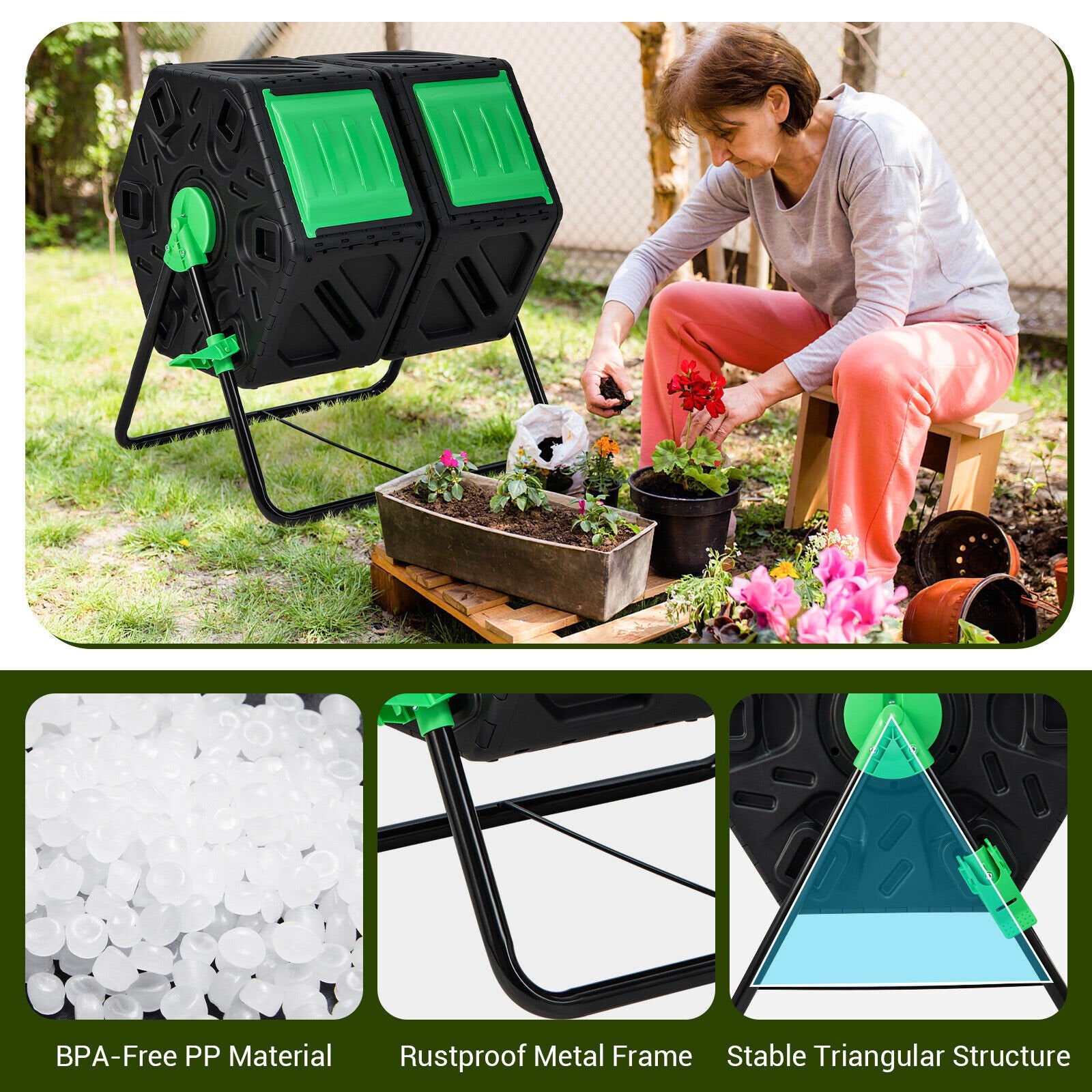 ● 360° Rotatable Design: 2 chambers can be separately rotated 360° which can speed up the composting process and there is no need to dig or mix the pile by hand. And it can be easily locked by side buckles. The rotating design is also convenient to pull out fertilizer.