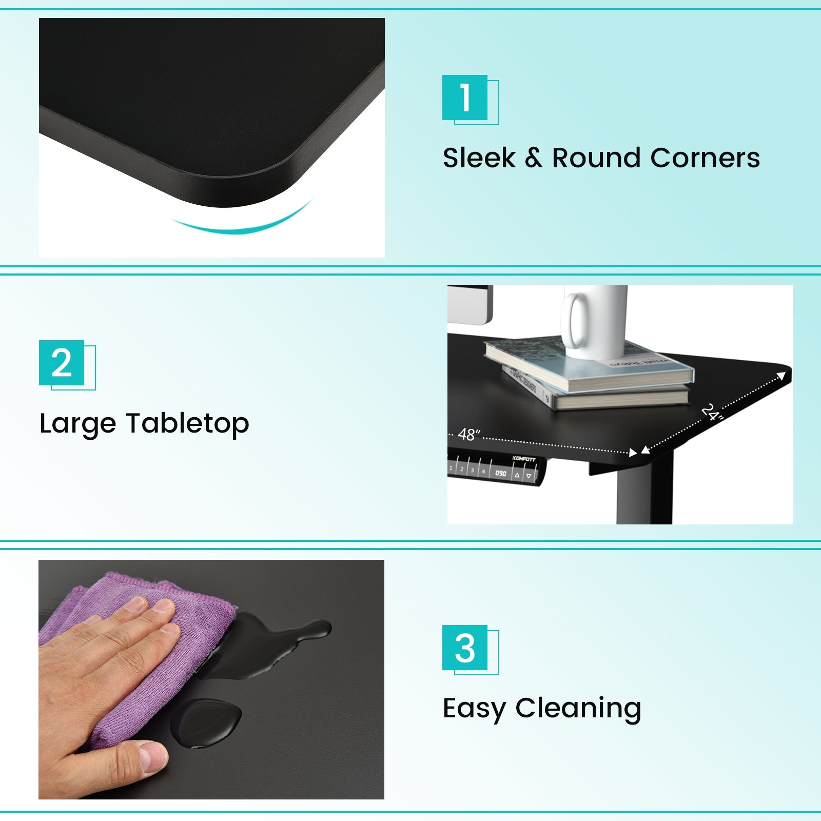 Equipped with a high-quality motor as well as a digital 4- button memory control panel the desk can be moved up and down smoothly and conveniently. You can find a comfortable standing or sitting position during working time thus improving working efficiency and reducing your back fatigue. What's more the large whole piece tabletop provides you with a spacious enough working area to help you organize your belongings in order. Supported by a thickened steel frame this sit-stand desk perfectly serves you without cracking or deforming. More the advanced anti-collision technology is built to protect the table from bumps and scratches which means that the desk will stop running when encountering an external force.