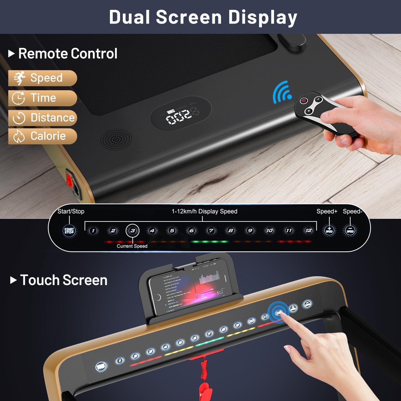 ● Innovative 2-in-1 Folding Design: It has 2 modes that can be used for walking and jogging. When the handrail is folded it can be used as an under-desk treadmill at a speed of 1-4 km/h. Unfold the handrail with its 1-12 km/h speed to enjoy running and reach the fitness goal.