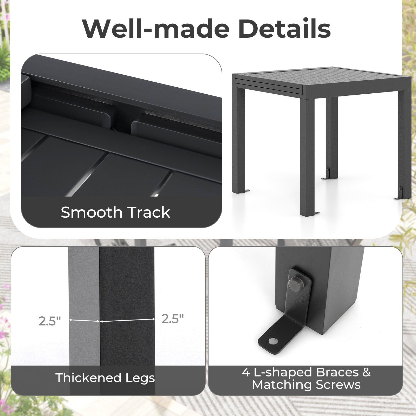 ● High-Level Stability: This patio dining table features 4 2.5" thickened table legs for reinforced sturdiness. Moreover the bottom of each leg is firmly fixed to the ground by L-shaped brace ensuring that the table can stand without wobbling.