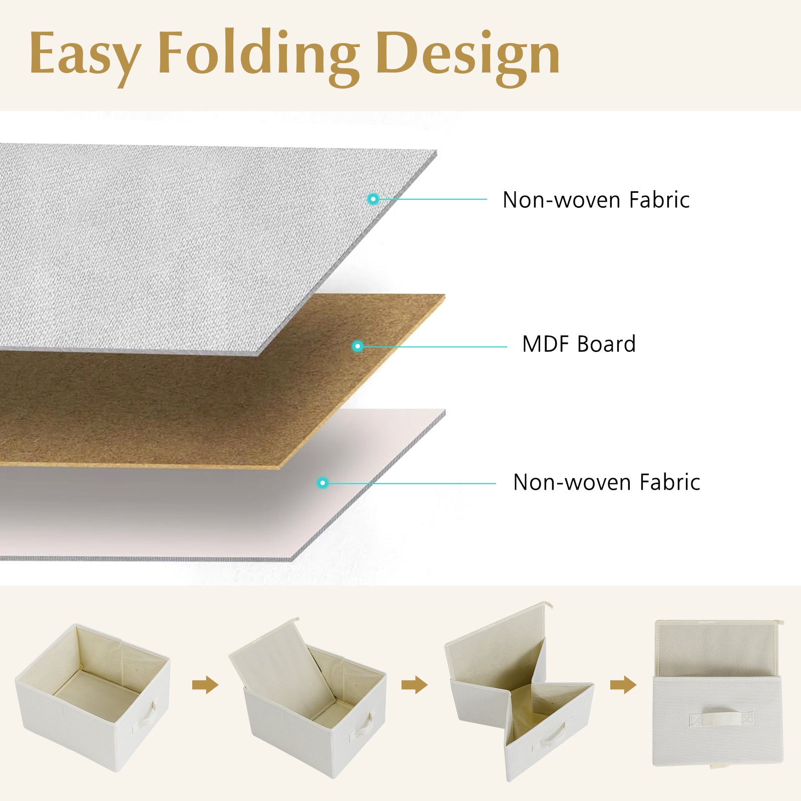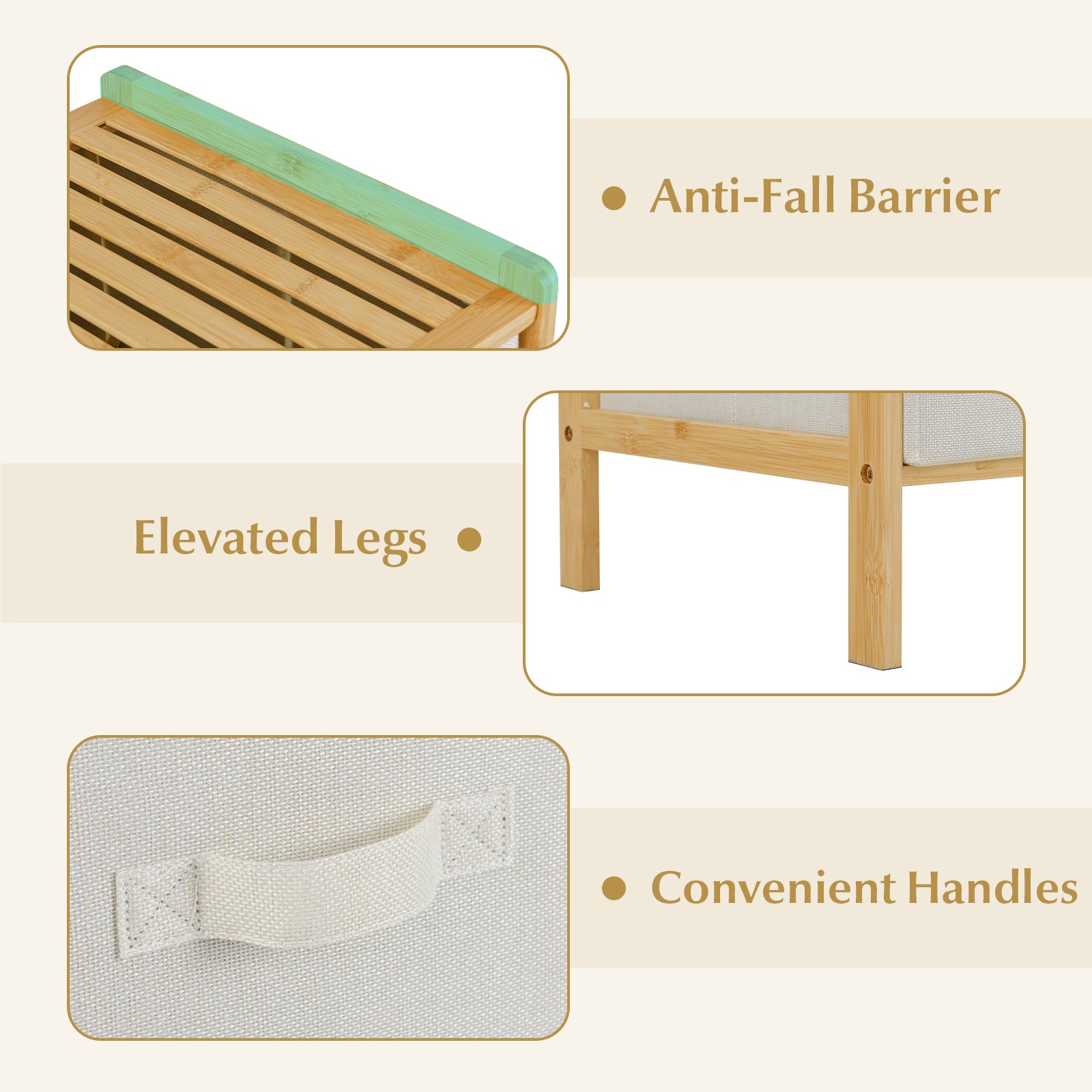 ● User-Friendly Details: The fabric drawers are designed for hassle-free setup allowing simple organization. Elevated legs facilitate easy cleaning underneath the unit while convenient handles and top anti-fall barriers enhance usability and safety.