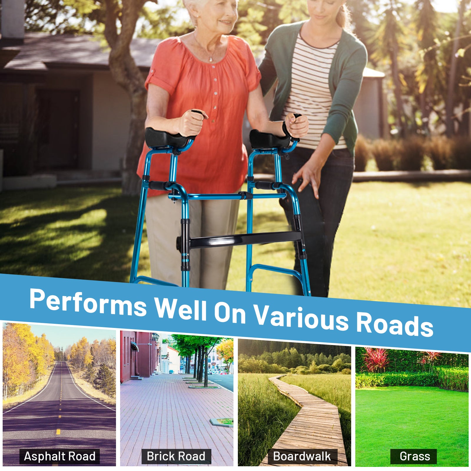 ● Foldable and Lightweight Design: This walker comes with one-click design which provides you with convenience to fold and store. The space-saving and lightweight walker can be effortlessly put into your car cabinets or any corners. Moreover two 5-inch front wheels help you to easily move around.