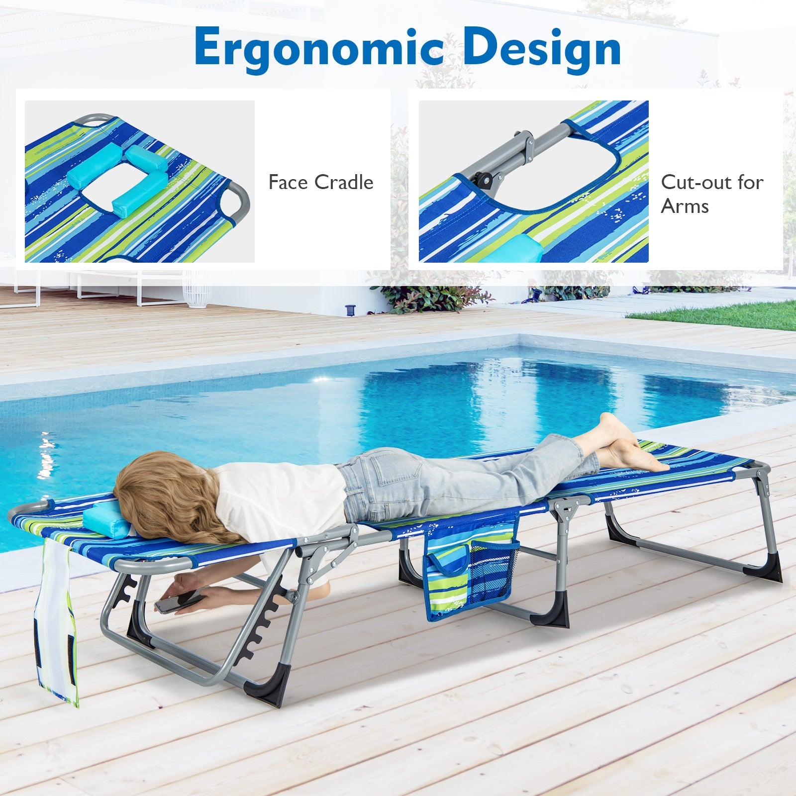 ● Removable Pillow and Face Cavity: This versatile beach chair is equipped with a removable pillow and a face downhole. The soft pillow relieves the pressure on your neck and the face cavity with arm slots allows you to watch your cell phone or books while lying face down.