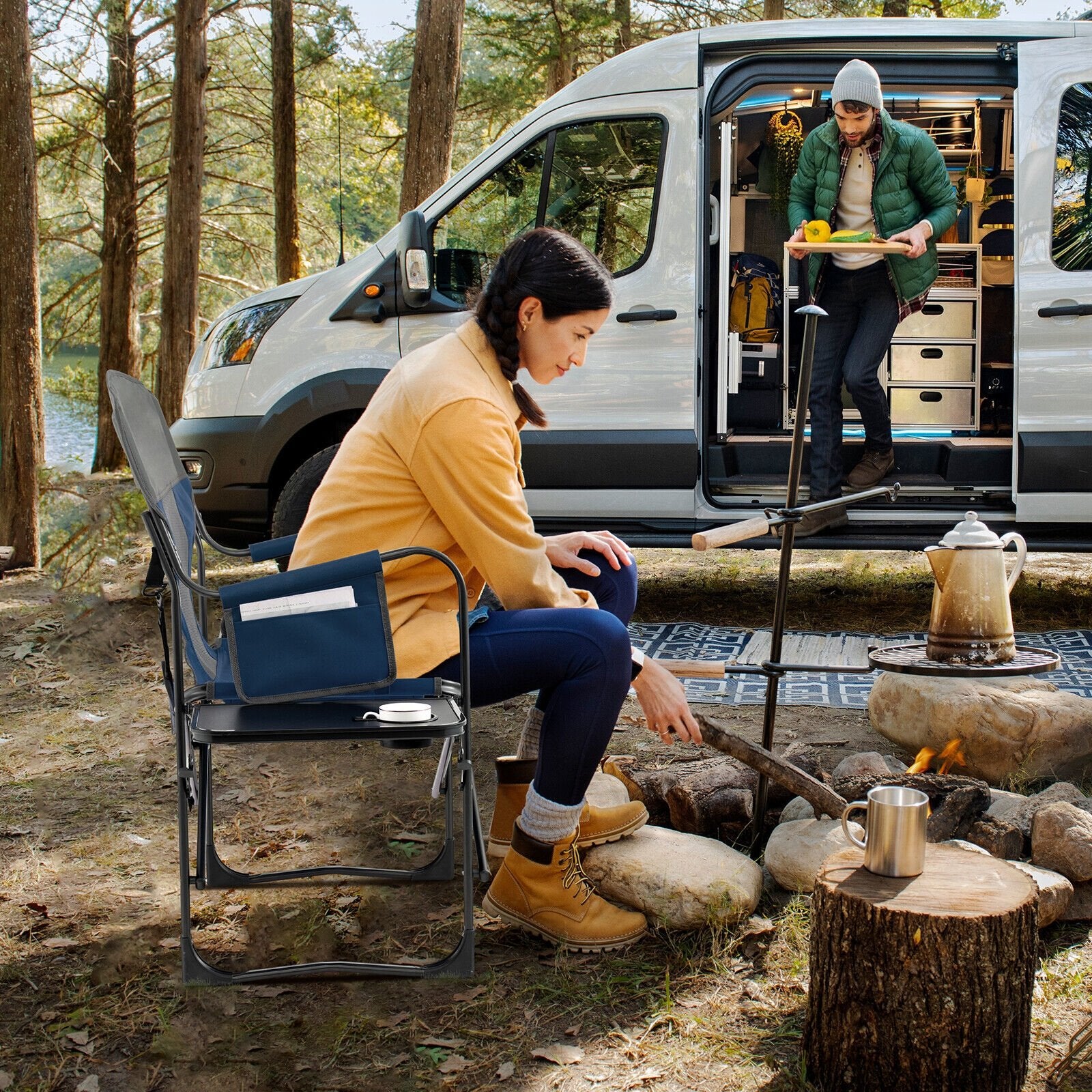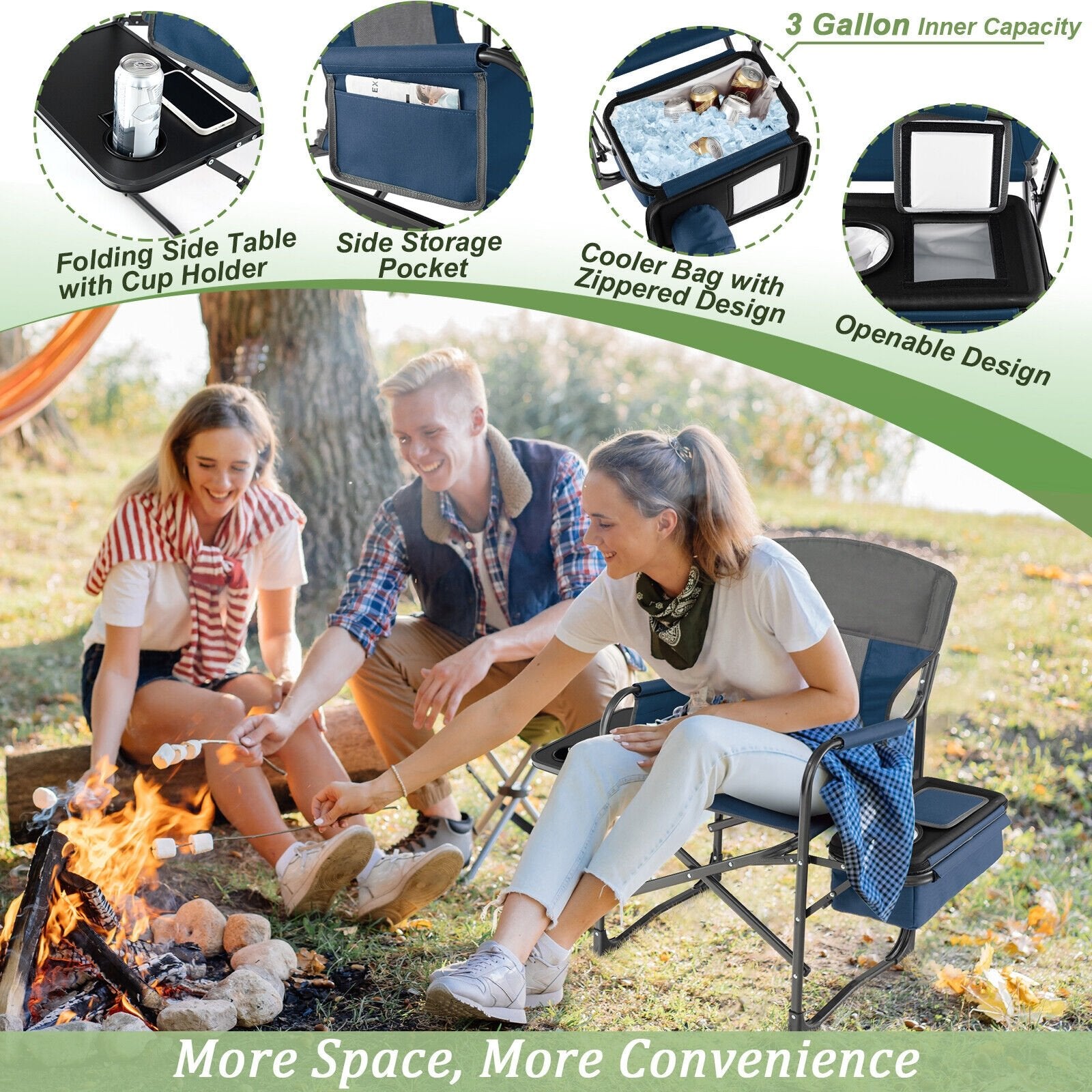 Folding Camping Directors Chair with Cooler Bag and Side Table-Blue