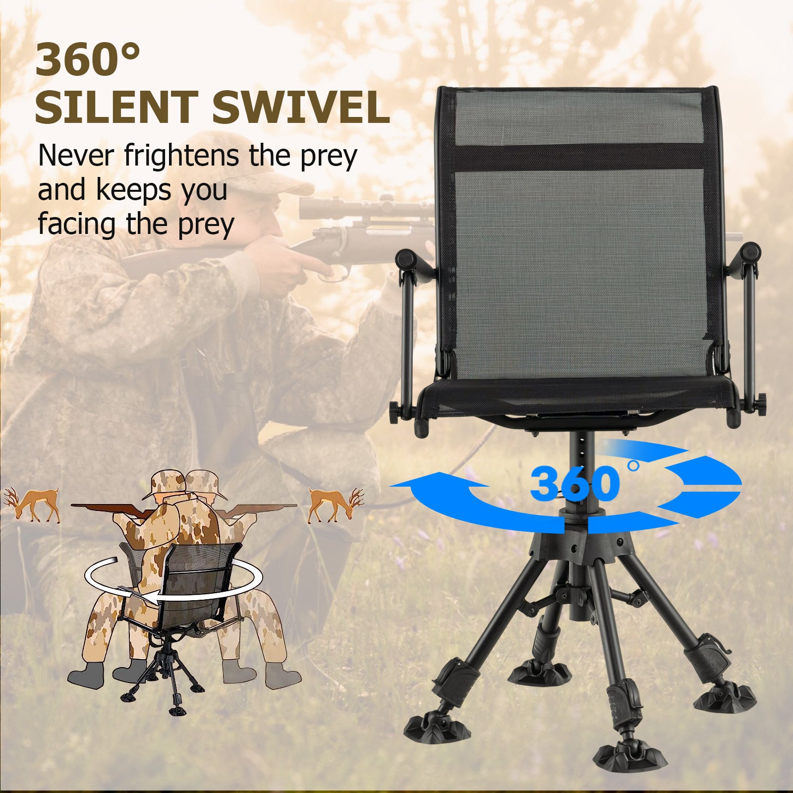 ● Telescopic Legs and Stable Frame: The swivel chair has 8.5" of height adjustment to meet the needs of different situations allowing you to start the hunt at your best state. In addition the rotating chair is made of metal structure with a rust-resistant finish that ensures reliable stability and can support up to 330 lbs.