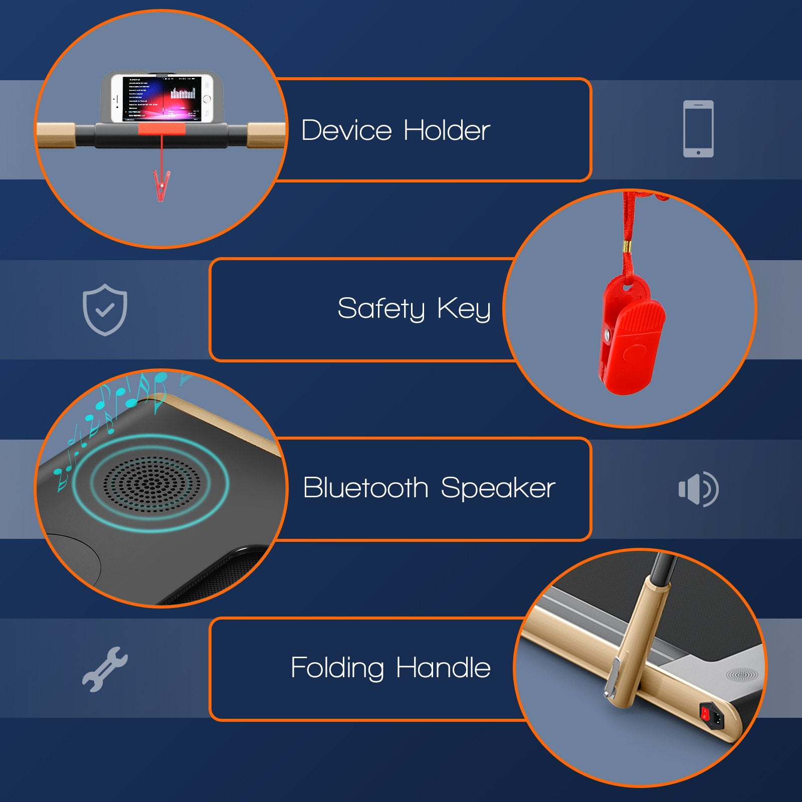 Its ultra-quiet motor and design structure allows it to be used at the home office and gym with no disturbances. Back joints knees muscles and ankles are provided great cushioning with its 7-layered anti-skid and shock-absorbing running belt. Moreover all your workout’s real-time details are displayed on the versatile LED display. Next the phone holder only is there to ease the placement and usage of your phone while exercising. Thanks to the remote control and emergency stop button the user is guaranteed safety in case of a mishap.
