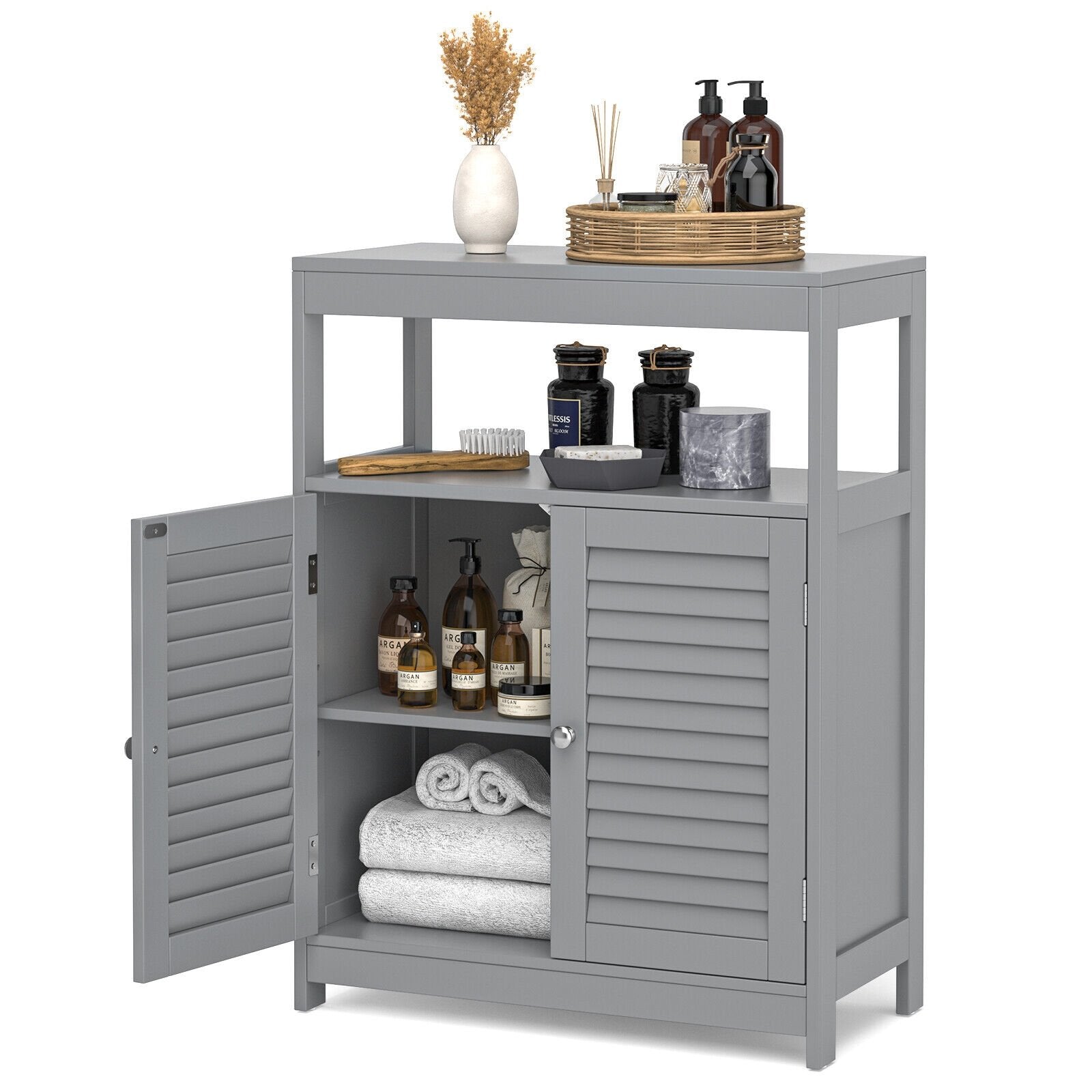 ● Large Storage Space: This bathroom cabinet can make full use of the available space to provide an ideal storage solution. Wide top and open shelf are suitable for potted plants aromatherapy photo frames magazines etc. And the cabinet with shutter doors provides additional hidden storage for towels shower gel or toilet paper.