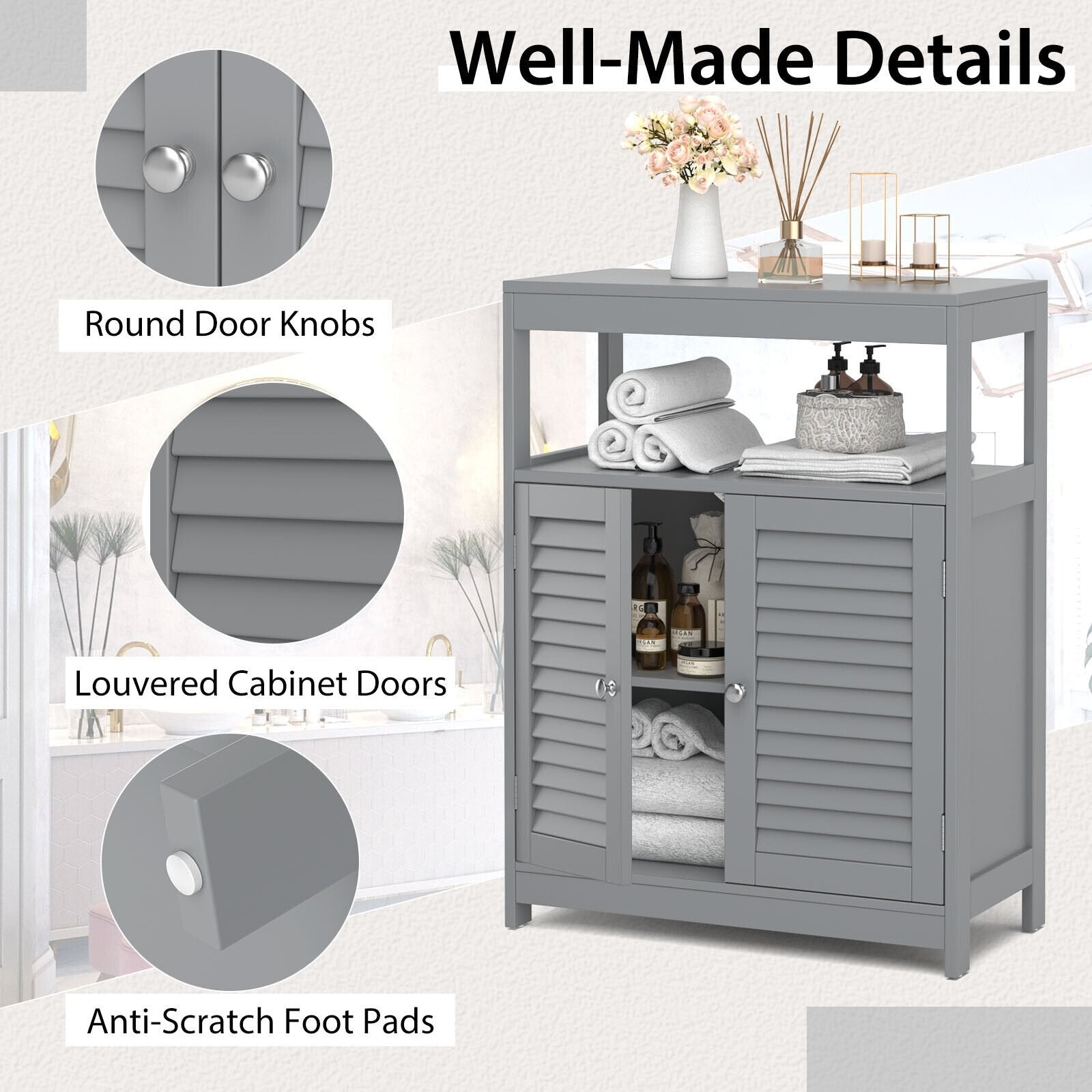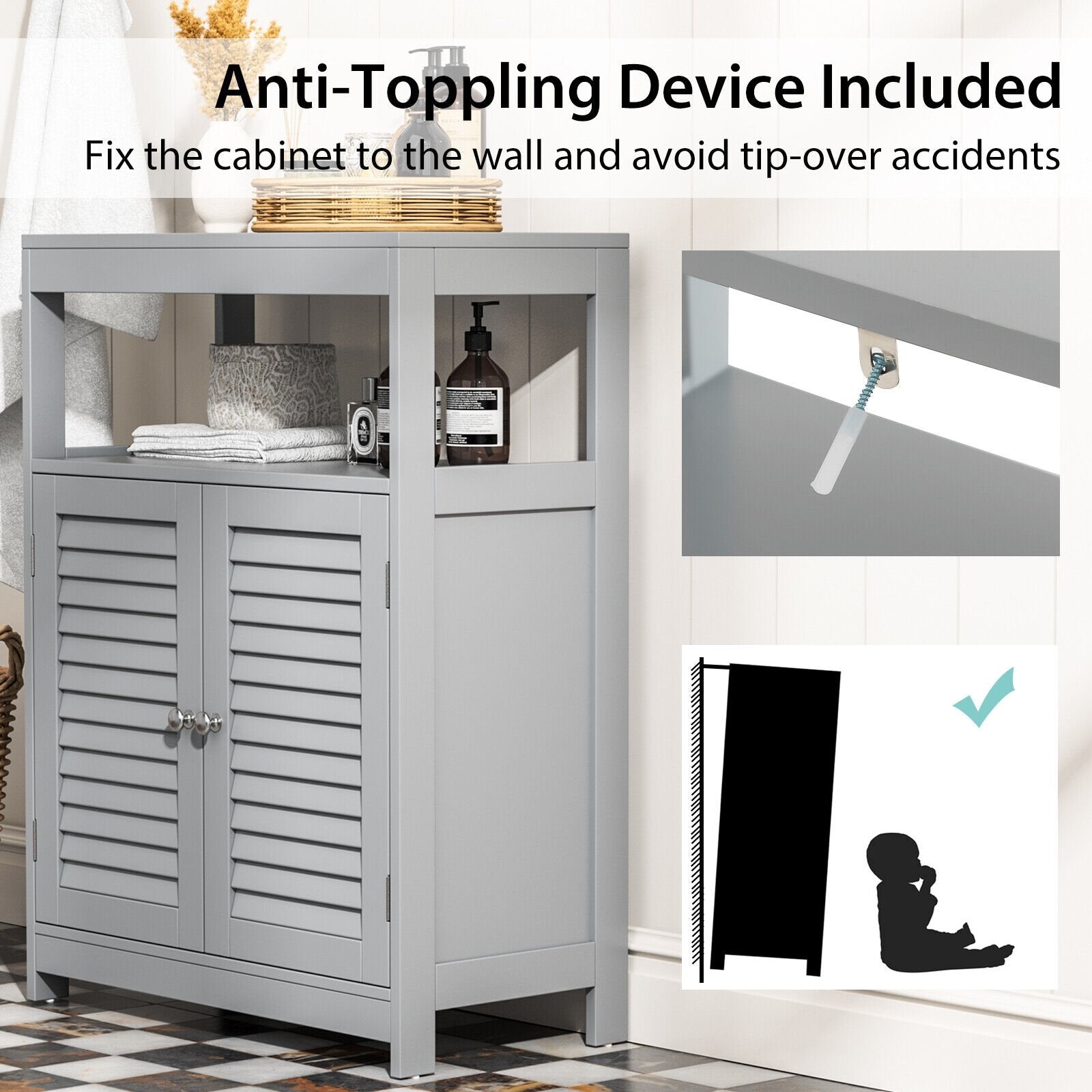 ● Convenient and Safe Use: The bathroom cabinet has an interior shelf with 3 adjustable heights which can meet the storage needs of items of different heights. Smooth metal knobs make the doors easy to open and close. In addition with an anti-tipping device on the back this cabinet can be secured to the wall to avoid wobbling or tipping.