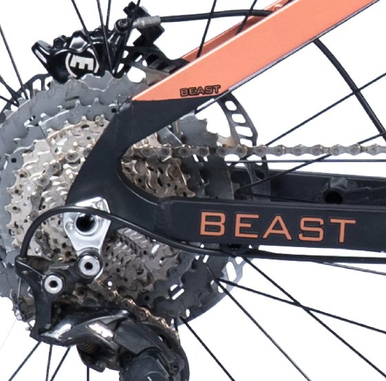 The bike performs as its name - Beast. This full suspension electric mountain bike features a frame design with a carbon fiber front triangle and a coil spring rear shock. As the longest range ebike, it boasts a peak power of 1800W and a 1470Wh battery for long-lasting rides.