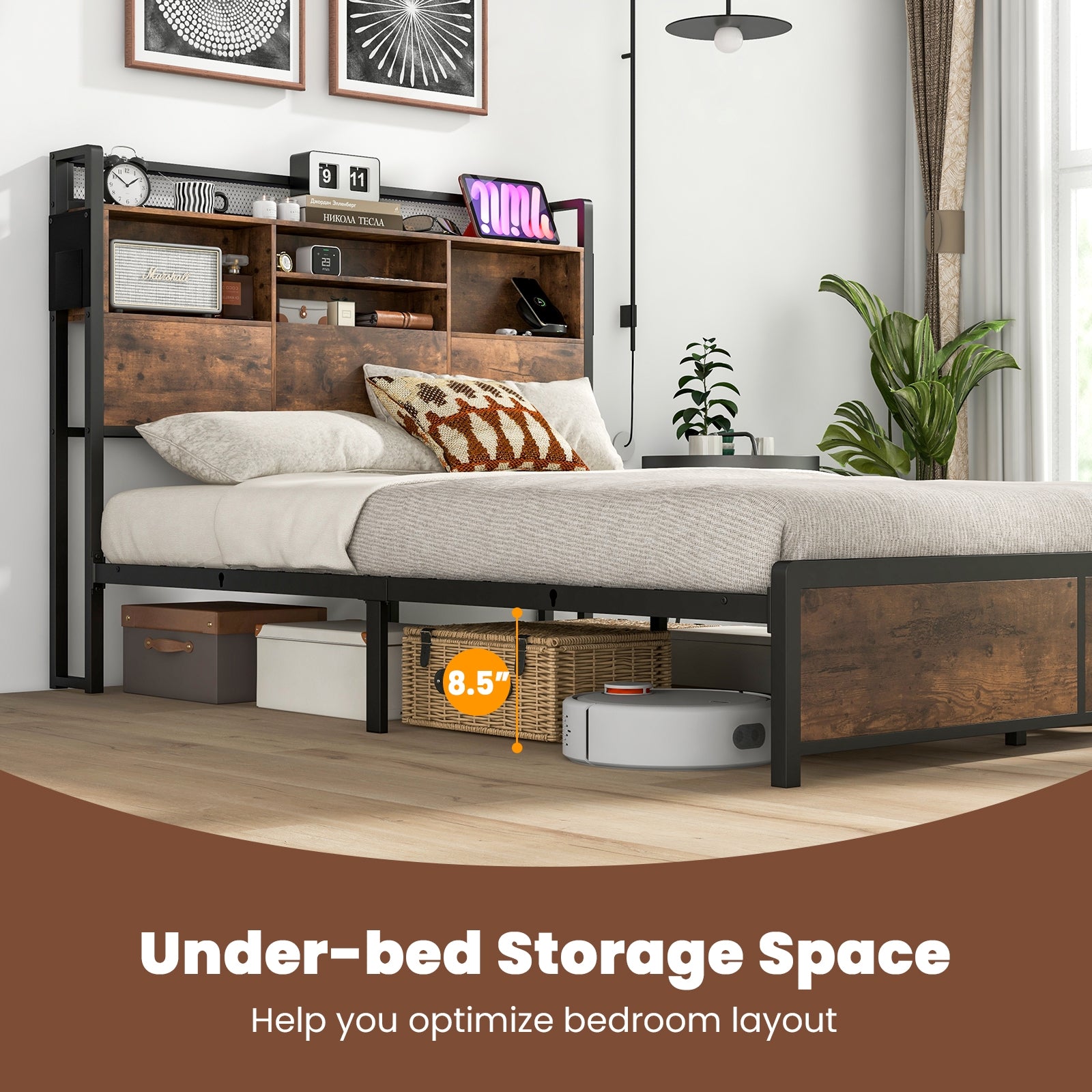 Full/Queen Size Bed Frame with 3-Tier Bookcase Headboard and Charging Station-Full Size