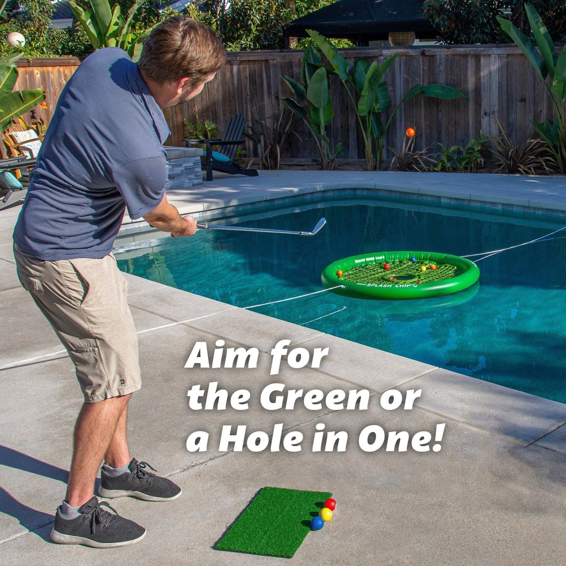 SPLASH CHIP: A fun new chipping challenge for the pool; Set includes inflatable Splash Chip target, 16 foam golf balls, 1 golf chipping mat and 2 tethering ropes for fun games