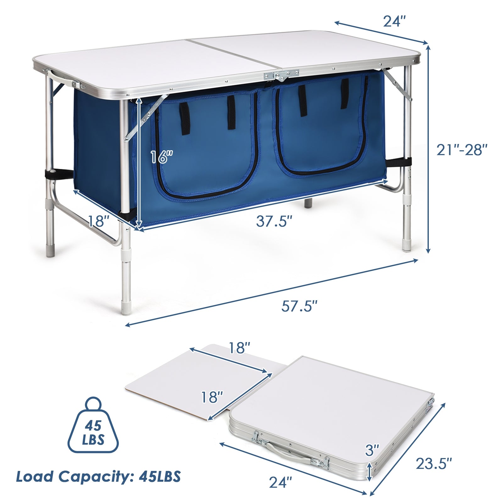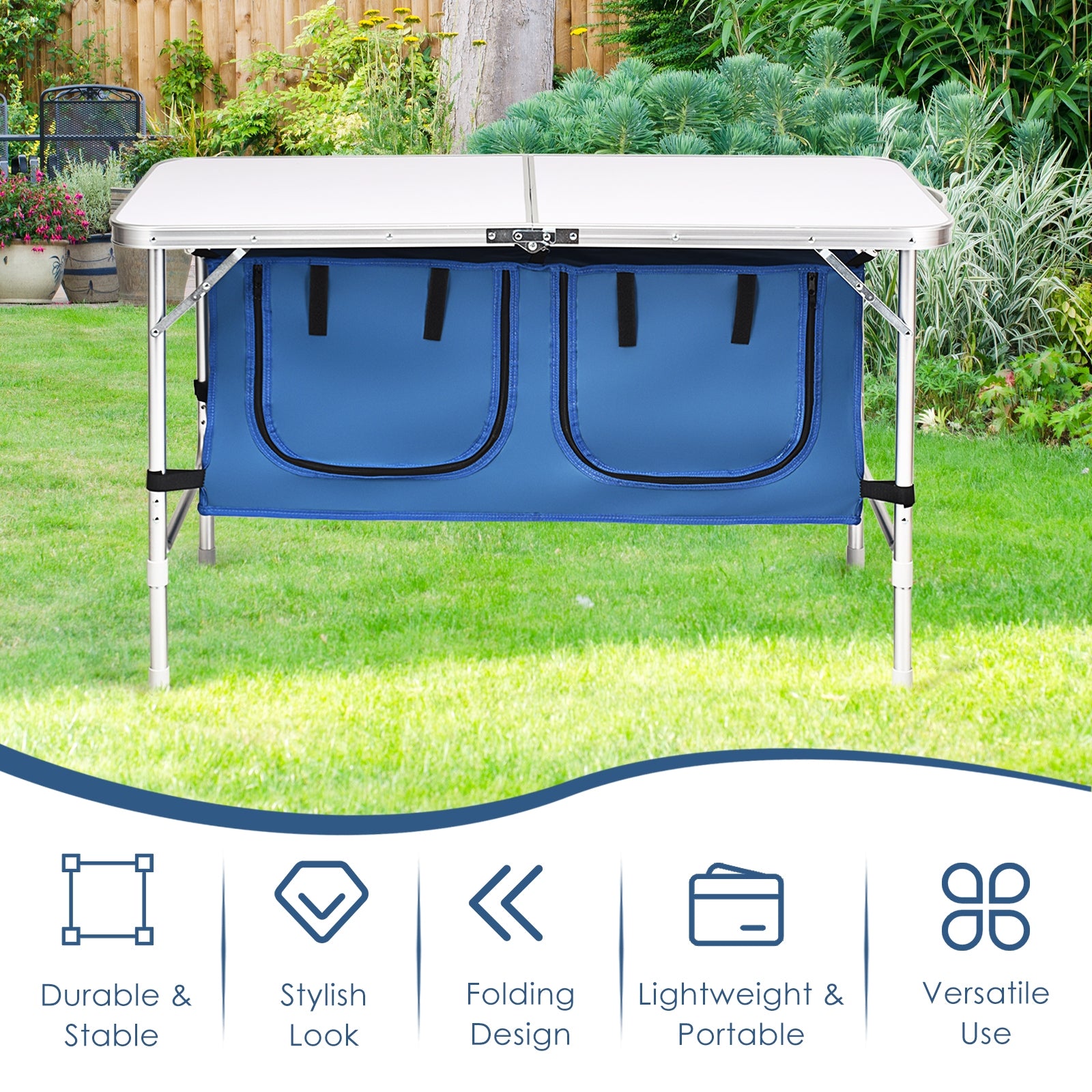 Detachable table legs give you two different heights. In addition you can easily adjust the height and balance of the table by rotating the knobs at the bottom of the table legs. The triangular structure and reinforcement measure greatly improve the stability and load-bearing capacity of the table. More importantly this outdoor folding table has a large storage area. When you have finished assembling the table you can put food drinks or utensils into the locker.