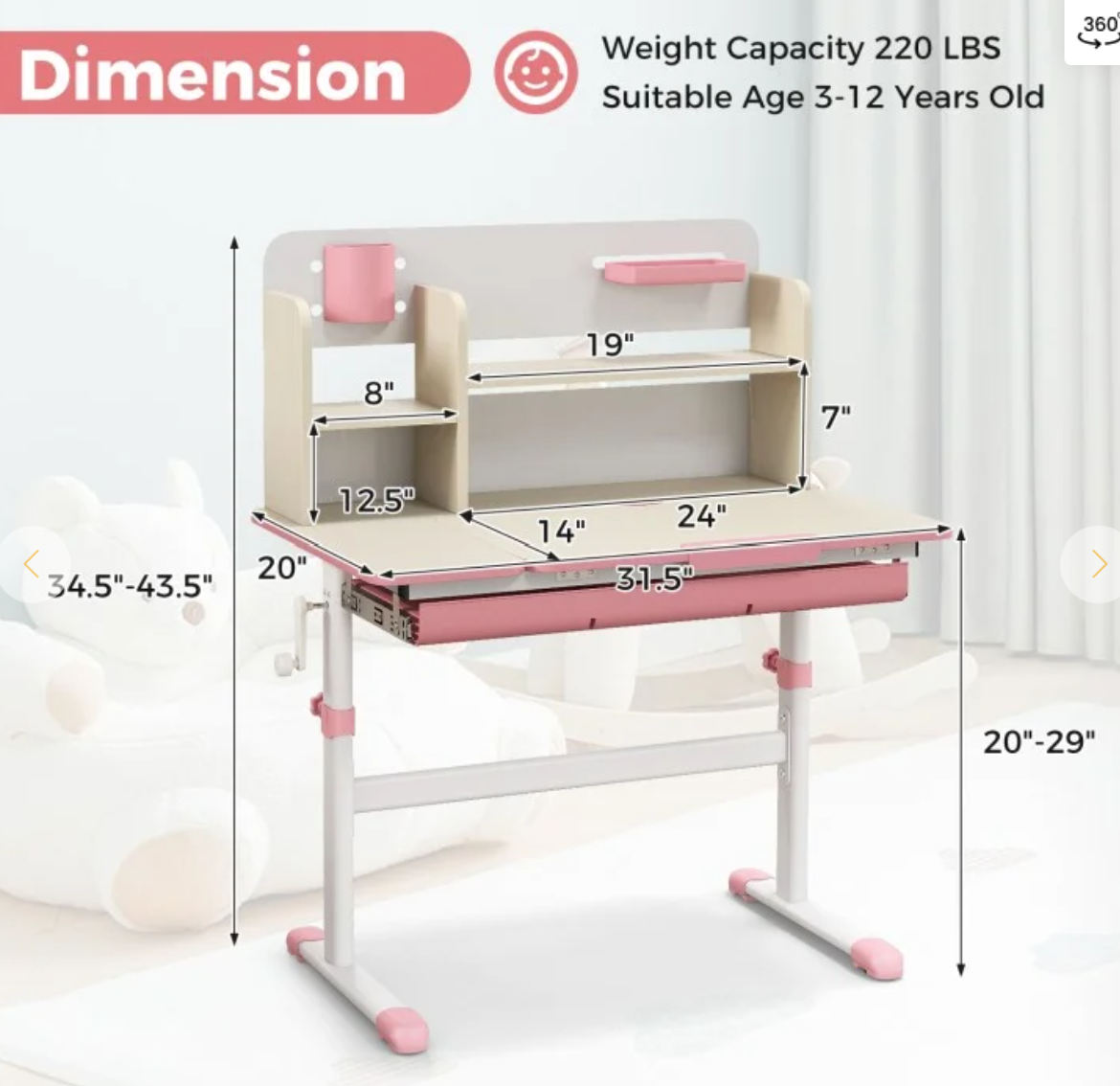● Adjustable Height: The tabletop height of this study desk can be easily adjusted between 20"-29" by rotating the lever and fixing locking knobs. This height-adjustable desk can grow up with your child and ensure a perfect posture for homework, art projects and more.