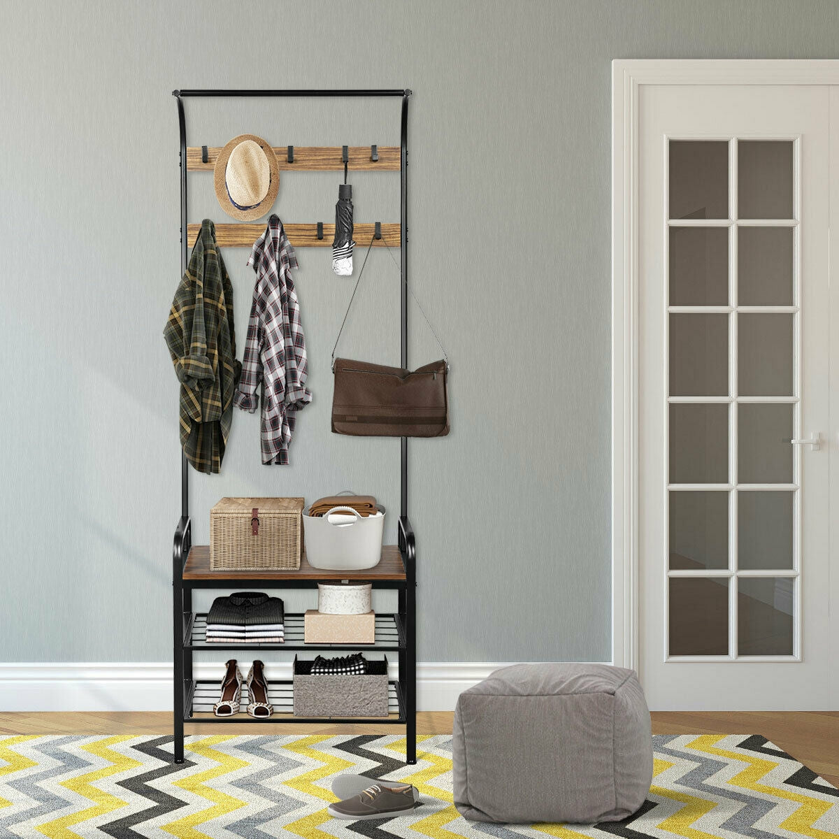 - A perfect combo of hanging rod coat rack and 3-tier shoe bench