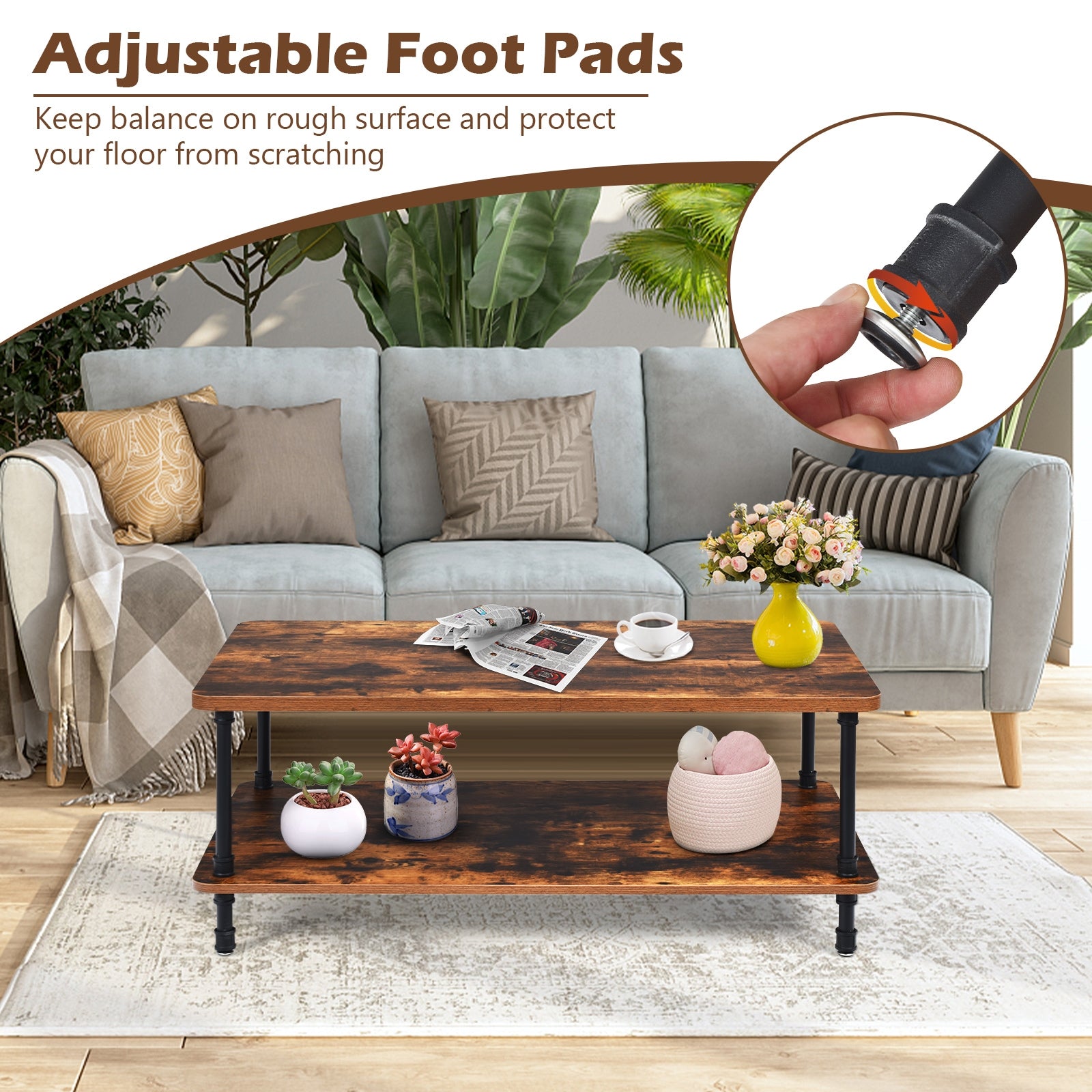 Double-layer design provides large storage space for daily use. The 43.5" x 23.5" tabletop is ideal for placing vases fruits and snacks while the bottom shelf offers extra storage space for magazines TV remote controls and other sundries. Characterized by its rustic brown tabletop and black bare steel legs this cocktail table will perfectly match any retro or industrial room layout. It can be either used in your living room as a tea table or in the bedroom as a TV stand. Combining the aesthetic value and practicality this retro coffee table must be an eye-catching addition to your home decor.