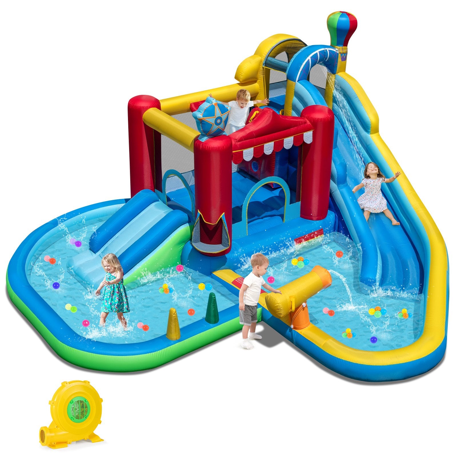 ● Ultimate Water Fun: Dive into excitement with the inflatable water park designed for children aged 3-12. Featuring an exhilarating water slide a refreshing splash pool and an interactive water cannon it ensures endless hours of fun and laughter.